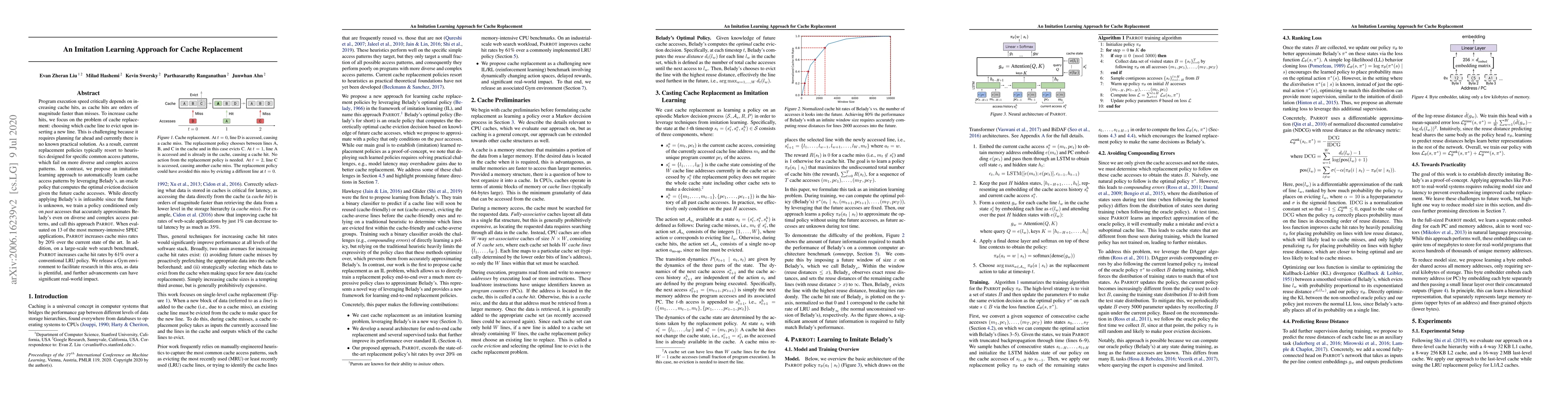 The paper introduces Parrot, an imitation learning approach for cache replacement that learns from Belady's optimal policy, using a ranking loss function and a differentiable approximation of NDCG with reuse distance as the relevance metric.