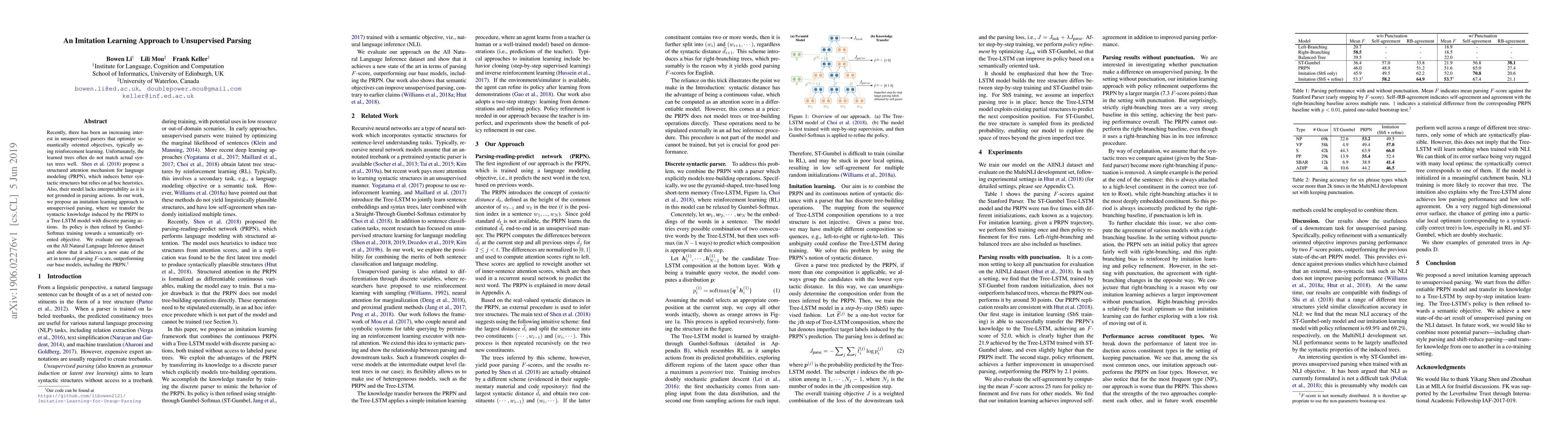 This paper proposes an imitation learning approach for unsupervised parsing, transferring syntactic knowledge from a PRPN model to a Tree-LSTM with discrete parsing actions, refined by Gumbel-Softmax training. The method achieves a new state-of-the-art parsing $F$-score on the All Natural Language Inference dataset.