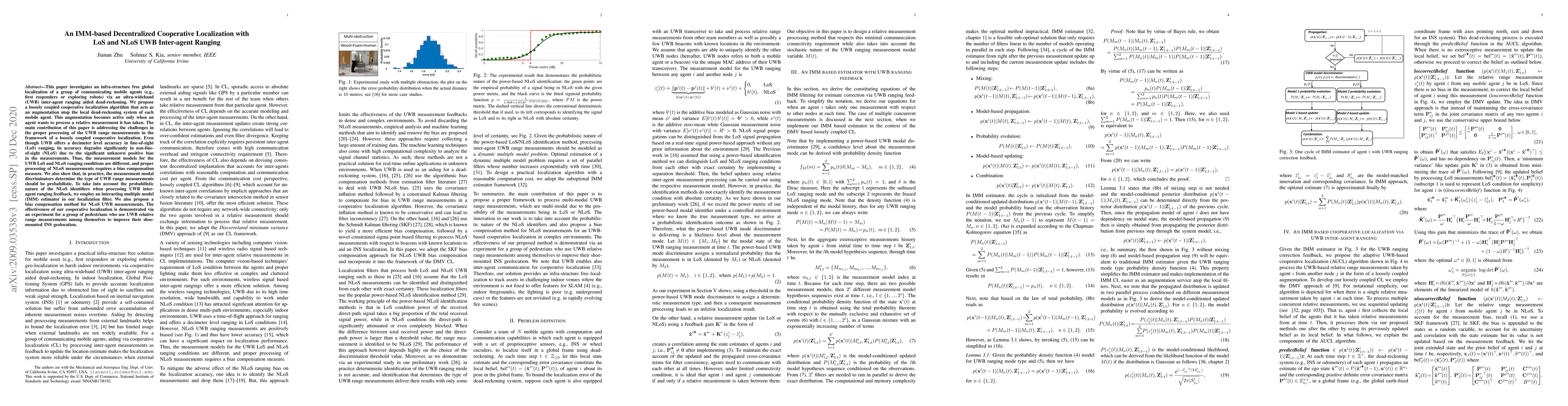 This paper proposes a decentralized cooperative localization algorithm for mobile agents using ultra-wideband (UWB) inter-agent ranging, addressing the challenges of UWB accuracy in both line-of-sight and non-line-of-sight conditions. It employs an interacting multiple model (IMM) estimator and a bias compensation method to handle the probabilistic nature of UWB measurements, demonstrating improved localization accuracy for a group of pedestrians.