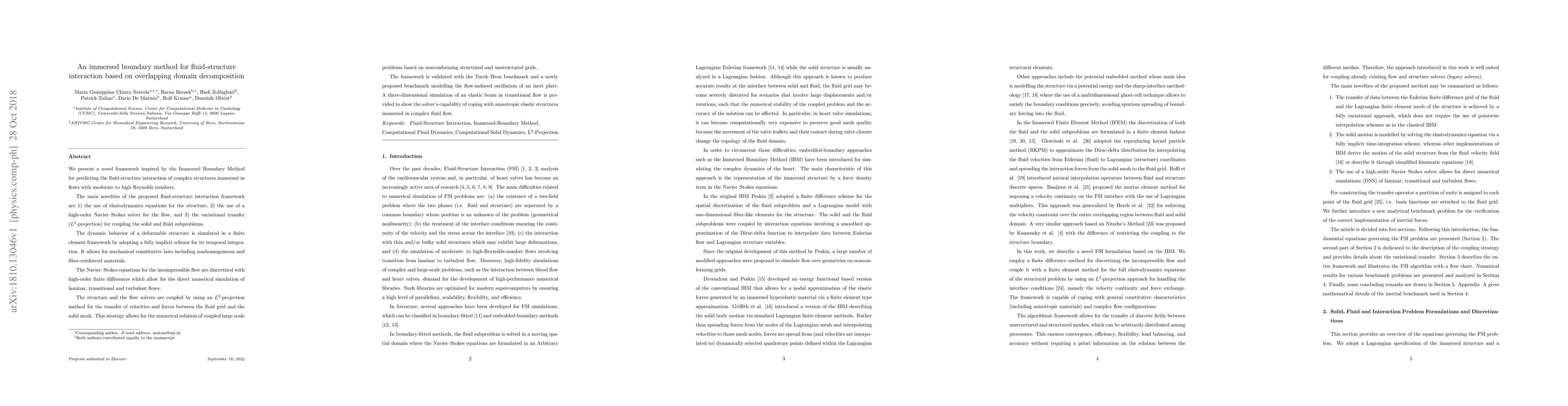This paper introduces a novel framework for fluid-structure interaction using the Immersed Boundary Method, featuring elastodynamics for structures, high-order Navier-Stokes solver for fluid, and variational transfer for coupling. The method is validated with benchmarks and demonstrates capability for complex, anisotropic structures in transitional flow.