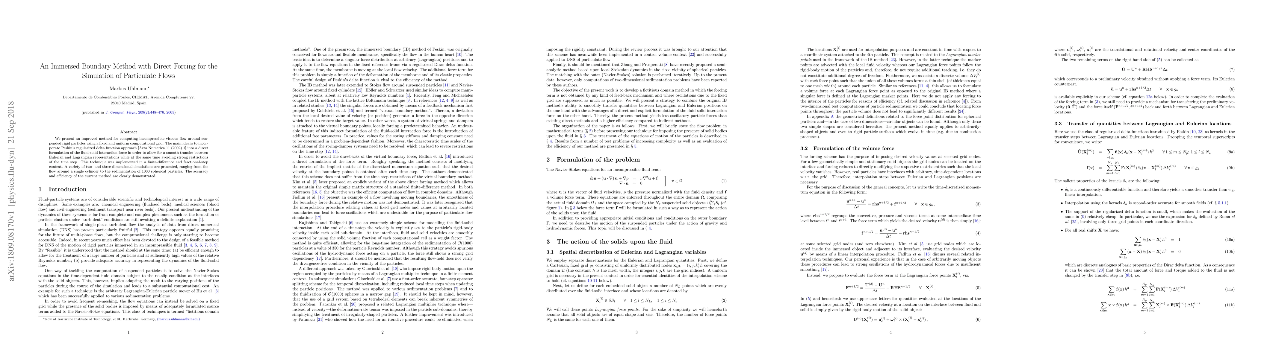 We present an improved method for computing incompressible viscous flow around suspended rigid particles using a fixed and uniform computational grid. The main idea is to incorporate Peskin's regularized delta function approach [Acta Numerica 11 (2002) 1] into a direct formulation of the fluid-solid interaction force in order to allow for a smooth transfer between Eulerian and Lagrangian representations while at the same time avoiding strong restrictions of the time step. This technique was implemented in a finite-difference and fractional-step context. A variety of two- and three-dimensional simulations are presented, ranging from the flow around a single cylinder to the sedimentation of 1000 spherical particles. The accuracy and efficiency of the current method are clearly demonstrated.