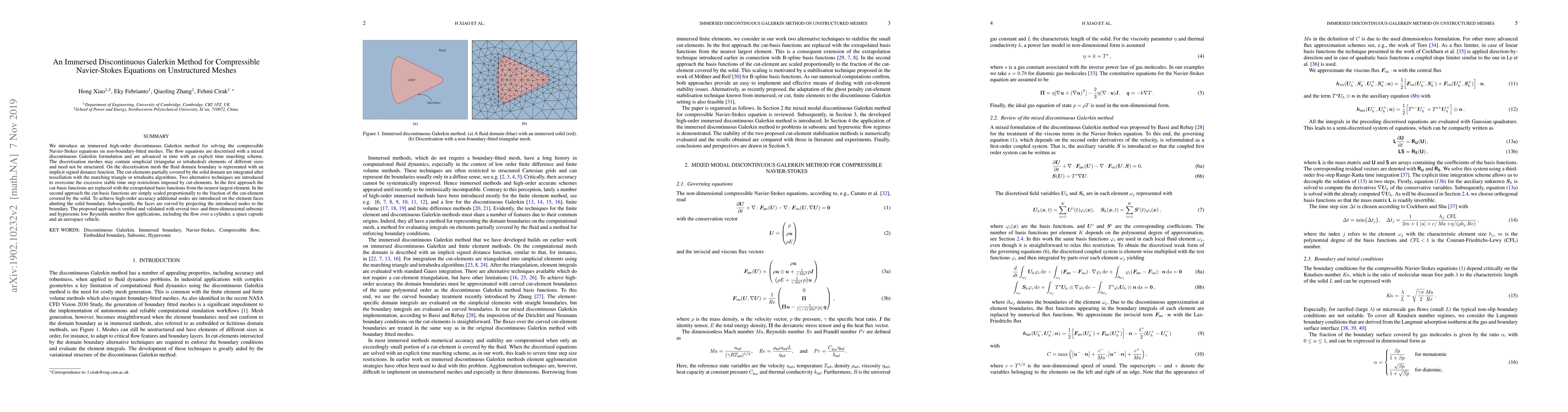 This paper presents an immersed high-order discontinuous Galerkin method for solving the compressible Navier-Stokes equations on unstructured meshes. It introduces techniques to handle cut elements and overcome stable time step restrictions, validated through various subsonic and hypersonic flow simulations.