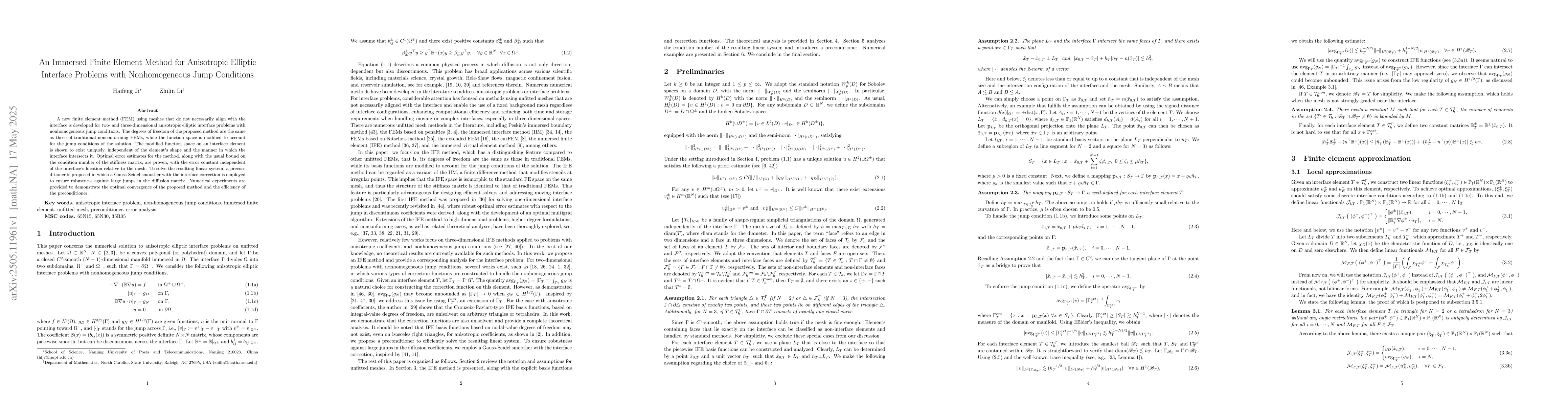 The introduction of an Immersed FEM for anisotropic elliptic problems with nonhomogeneous jump conditions, ensuring optimal error estimates and robust preconditioning.