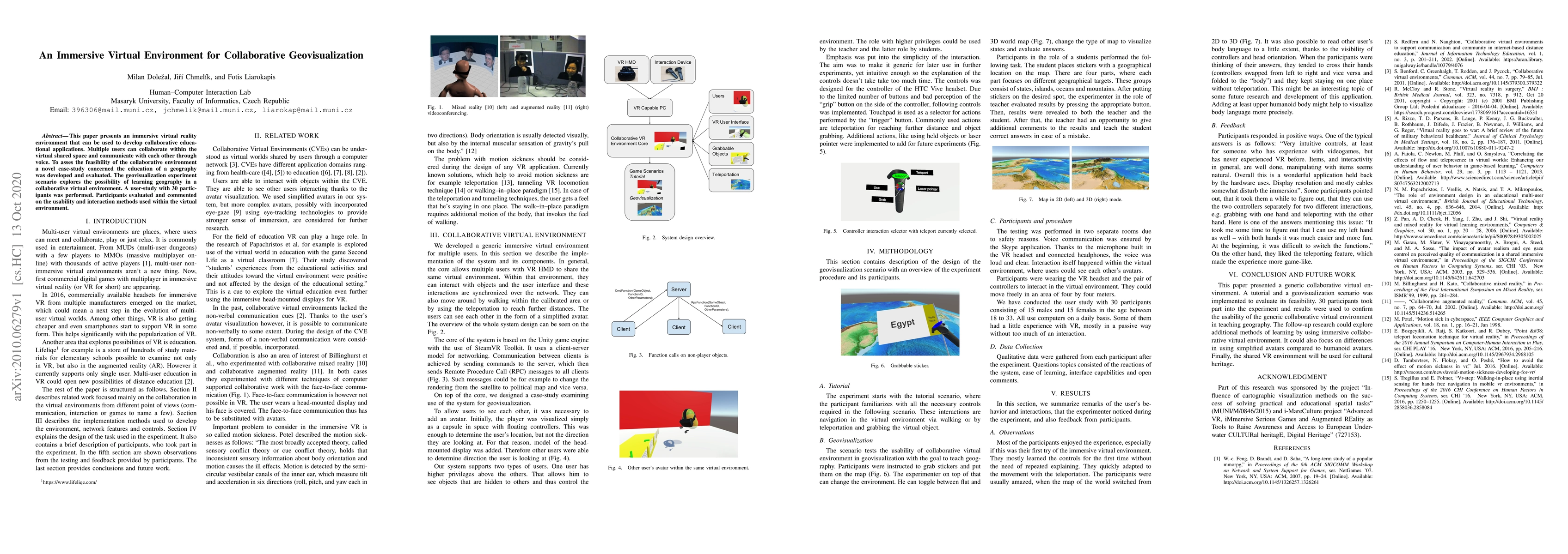 This paper introduces an immersive virtual reality environment for collaborative geovisualization, enabling multiple users to work together and communicate via voice. A case study on geography education was developed and evaluated through a user study with 30 participants, assessing the usability and interaction methods of the virtual environment.