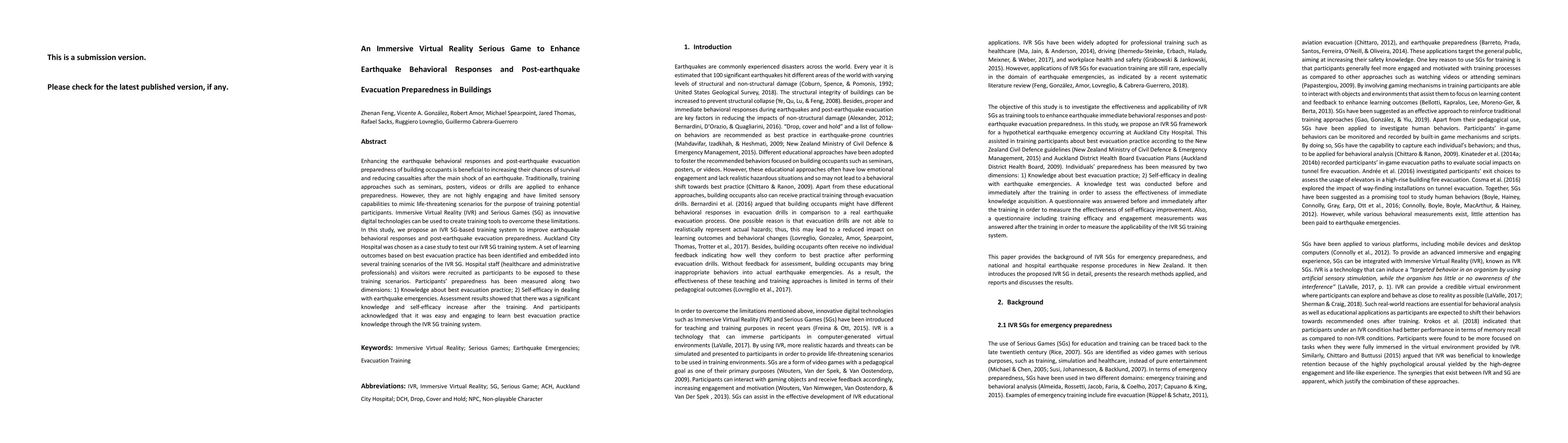 This study proposes an Immersive Virtual Reality Serious Game to enhance earthquake behavioral responses and post-earthquake evacuation preparedness in Auckland City Hospital. The training system significantly improved participants' knowledge and self-efficacy in dealing with earthquake emergencies, demonstrating the effectiveness of the innovative approach.