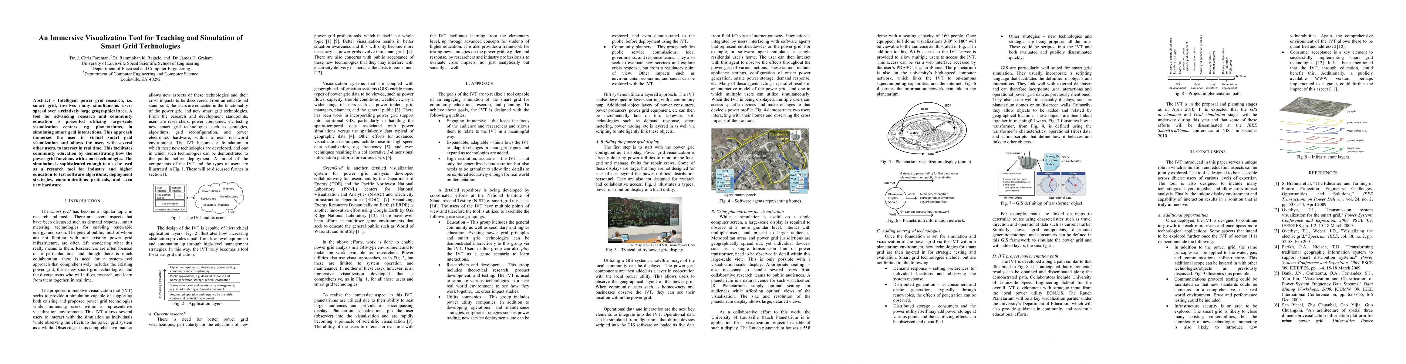 This paper presents an immersive visualization tool for teaching and simulating smart grid technologies using large-scale visualization centers. It facilitates real-time interaction among users and serves both community education and advanced research purposes.