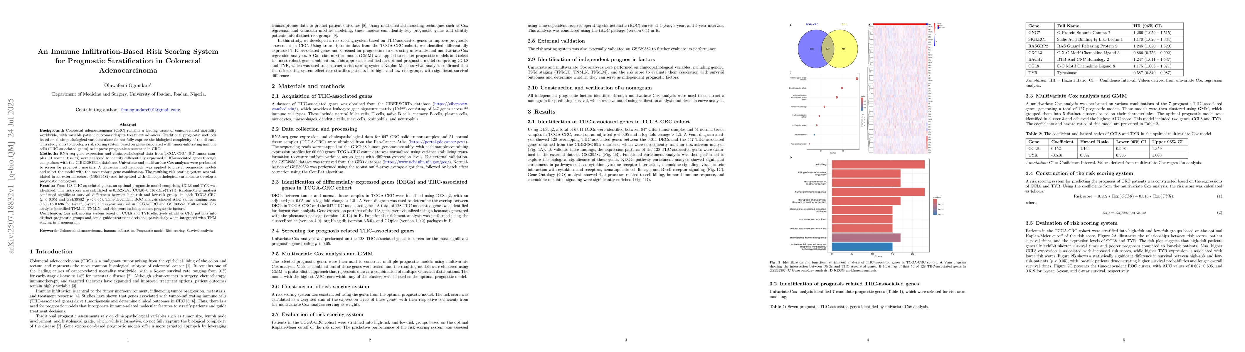 Background: Colorectal adenocarcinoma (CRC) remains a leading cause of cancer-related mortality worldwide, with variable patient outcomes despite treatment advances. Traditional prognostic methods based on clinicopathological variables alone do not fully capture the biological complexity of the disease. This study aims to develop a risk scoring system based on genes associated with tumor-infiltrating immune cells (TIIC-associated genes) to improve prognostic assessment in CRC. Methods: RNA-seq gene expression and clinicopathological data from TCGA-CRC (647 tumor samples, 51 normal tissues) were analyzed to identify differentially expressed TIIC-associated genes through comparison with the CIBERSORTx database. Univariate and multivariate Cox analyses were performed to screen for prognostic markers. A Gaussian mixture model was applied to cluster prognostic models and select the model with the most robust gene combination. The resulting risk scoring system was validated in an external cohort (GSE39582) and integrated with clinicopathological variables to develop a prognostic nomogram. Results: From 128 TIIC-associated genes, an optimal prognostic model comprising CCL8 and TYR was identified. The risk score was calculated as 0.152*Exp(CCL8) - 0.516*Exp(TYR). Kaplan-Meier analysis confirmed significant survival differences between high-risk and low-risk groups in both TCGA-CRC (p < 0.05) and GSE39582 (p < 0.05). Time-dependent ROC analysis showed AUC values ranging from 0.605 to 0.696 for 1-year, 3-year, and 5-year survival in TCGA-CRC and GSE39582. Multivariate Cox analysis identified TNM_T, TNM_N, and risk score as independent prognostic factors. Conclusion: Our risk scoring system based on CCL8 and TYR effectively stratifies CRC patients into distinct prognostic groups and could guide treatment decisions, particularly when integrated with TNM staging in a nomogram.