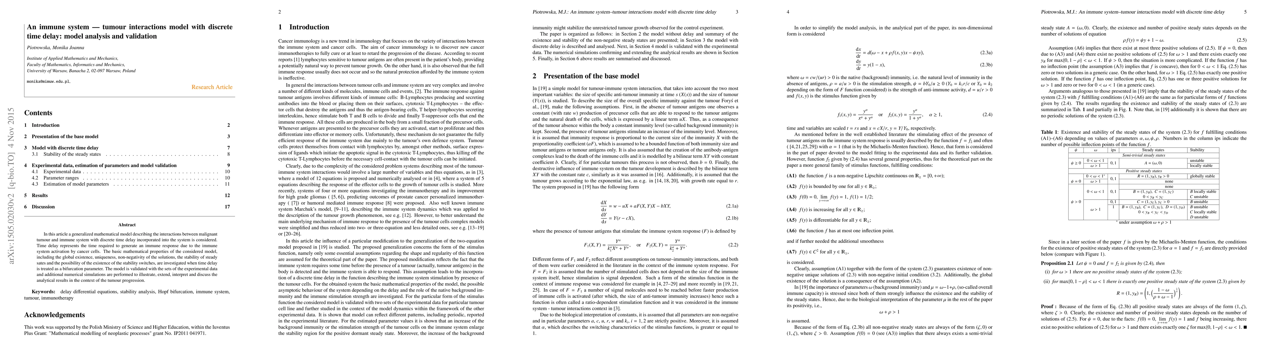 This paper develops a mathematical model to describe the interactions between a malignant tumour and the immune system, incorporating discrete time delays. It investigates the model's properties, including stability and potential bifurcations, and validates the model using experimental data and numerical simulations.