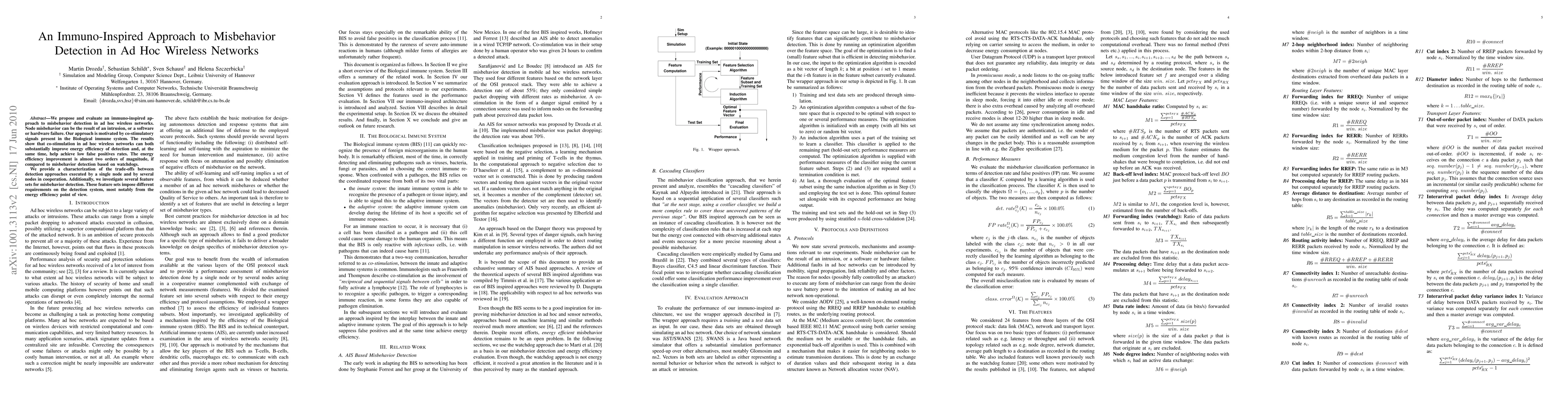 This paper proposes an immuno-inspired method for detecting misbehavior in ad hoc wireless networks, leveraging co-stimulatory signals from the biological immune system to enhance energy efficiency and reduce false positives. The approach shows significant improvements over traditional watchdog-based detection methods.
