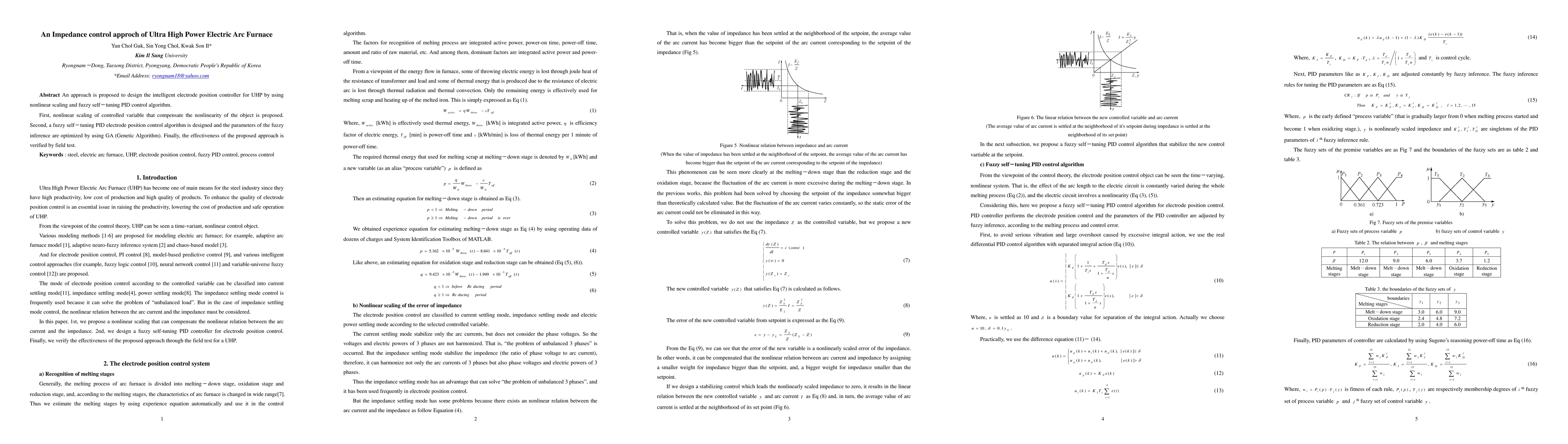 An approach is proposed to design the intelligent electrode position controller for UHP by using nonlinear scaling and fuzzy self tuning PID control algorithm. First, nonlinear scaling of controlled variable that compensate the nonlinearity of the object is proposed. Second, a fuzzy self tuning PID electrode position control algorithm is designed and the parameters of the fuzzy inference are optimized by using GA (Genetic Algorithm). Finally, the effectiveness of the proposed approach is verified by field test.