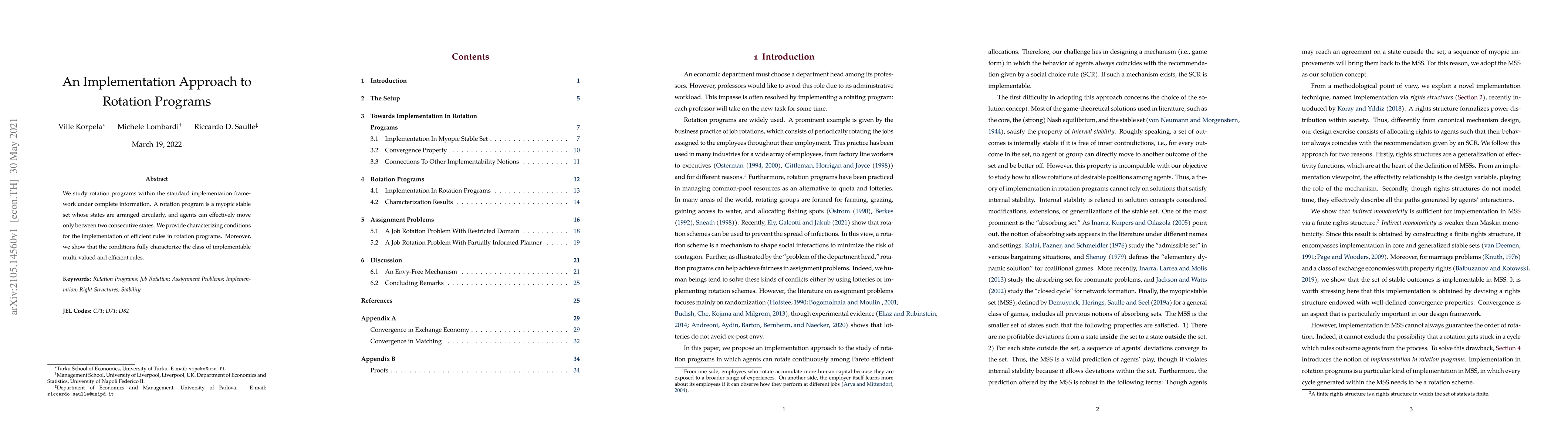 We study rotation programs within the standard implementation frame-work under complete information. A rotation program is a myopic stableset whose states are arranged circularly, and agents can effectively moveonly between two consecutive states. We provide characterizing conditionsfor the implementation of efficient rules in rotation programs. Moreover,we show that the conditions fully characterize the class of implementablemulti-valued and efficient rules
