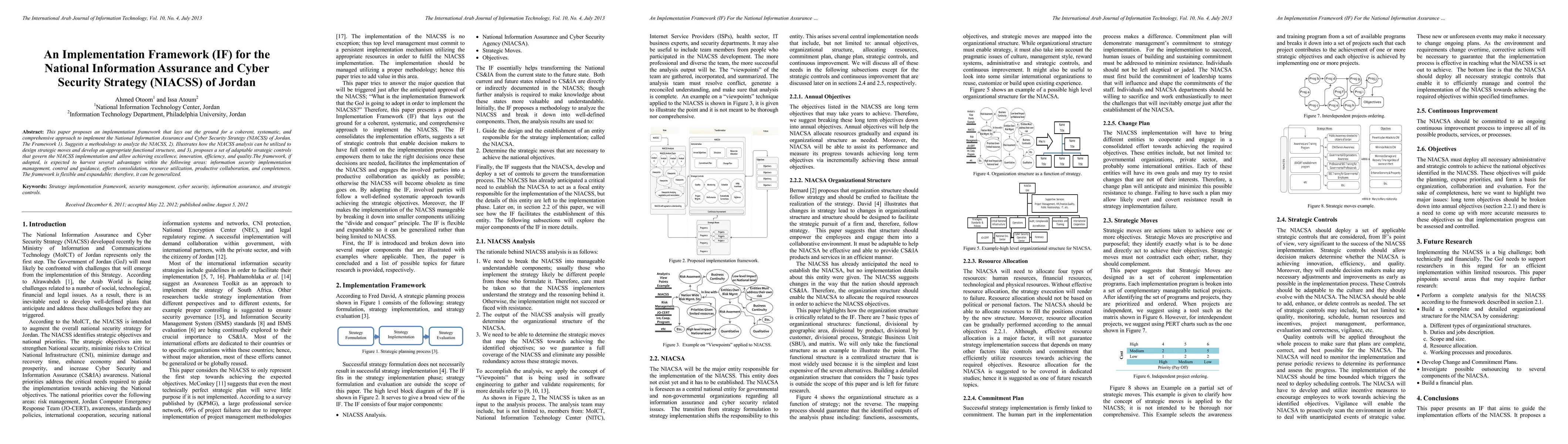 This paper proposes an implementation framework for Jordan's National Information Assurance and Cyber Security Strategy, outlining a methodology for analysis, strategic design, and adaptable controls to achieve excellence and efficiency in information security. The framework is designed to enhance management, collaboration, and resource utilization.