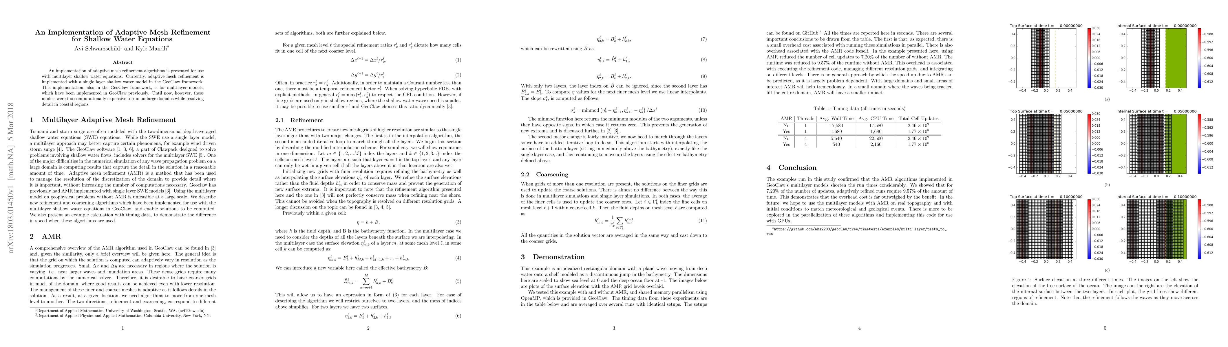 An implementation of adaptive mesh refinement algorithms is presented for use with multilayer shallow water equations. Currently, adaptive mesh refinement is implemented with a single layer shallow water model in the GeoClaw framework. This implementation, also in the GeoClaw framework, is for multilayer models, which have been implemented in GeoClaw previously. Until now, however, these models were too computationally expensive to run on large domains while resolving detail in coastal regions.