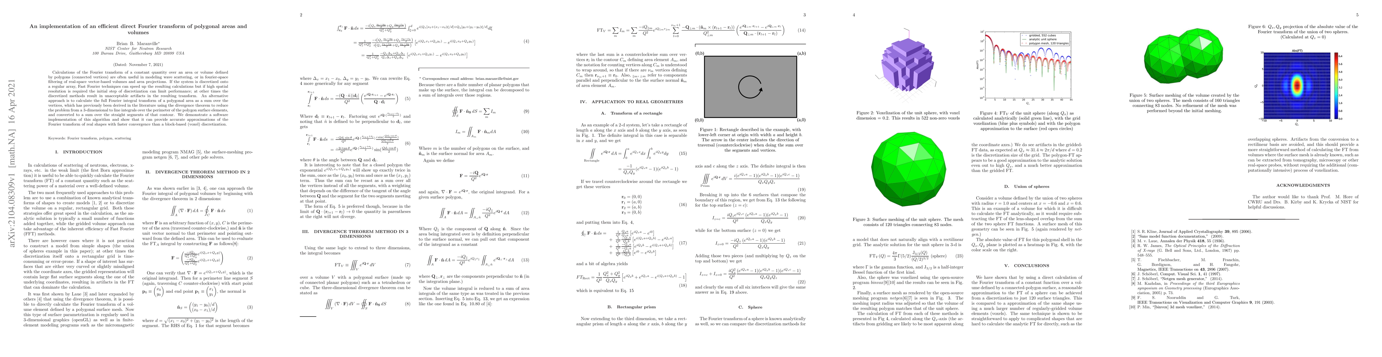 This paper presents an efficient algorithm for computing the Fourier transform of polygonal areas and volumes, avoiding the limitations of discretized methods. The method sums over polygon vertices, offering faster convergence and more accurate results compared to voxel-based discretization.