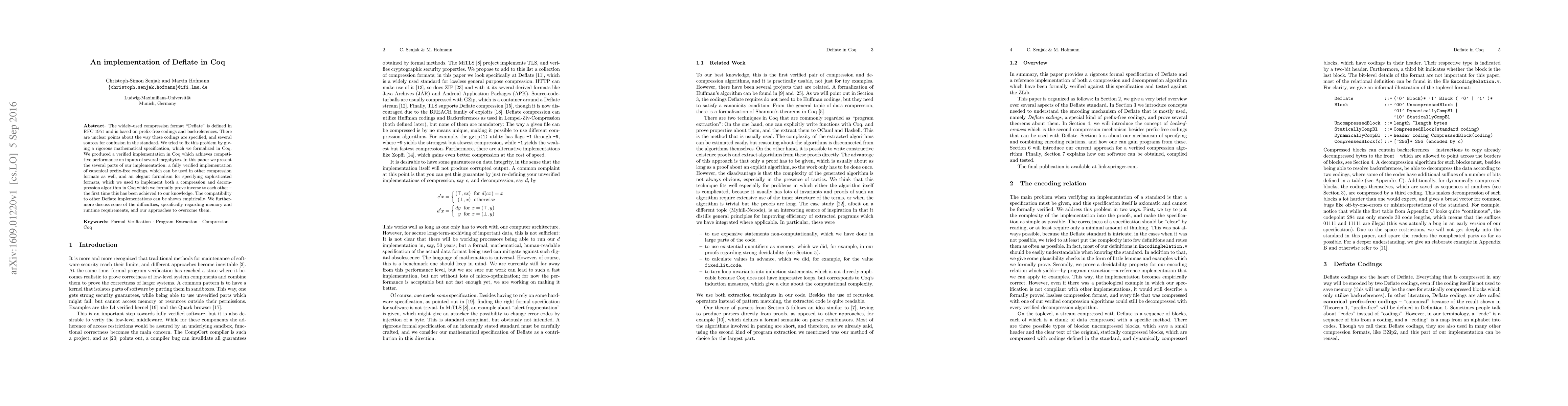 Researchers developed a verified implementation of Deflate compression format in Coq, achieving competitive performance and providing a rigorous mathematical specification for prefix-free codings.