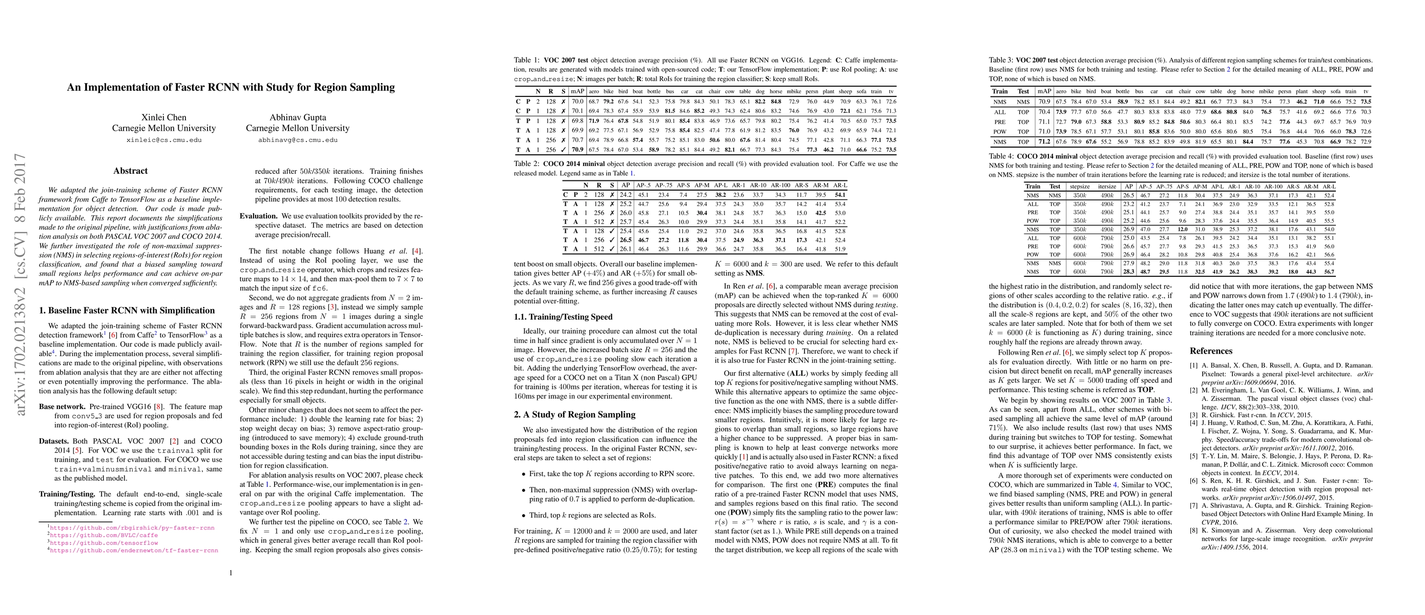 This paper implements Faster RCNN in TensorFlow, simplifying the original Caffe-based pipeline and making the code publicly available. The study found that biased sampling towards smaller regions during region-of-interest selection can achieve comparable performance to non-maximal suppression, enhancing detection efficiency.