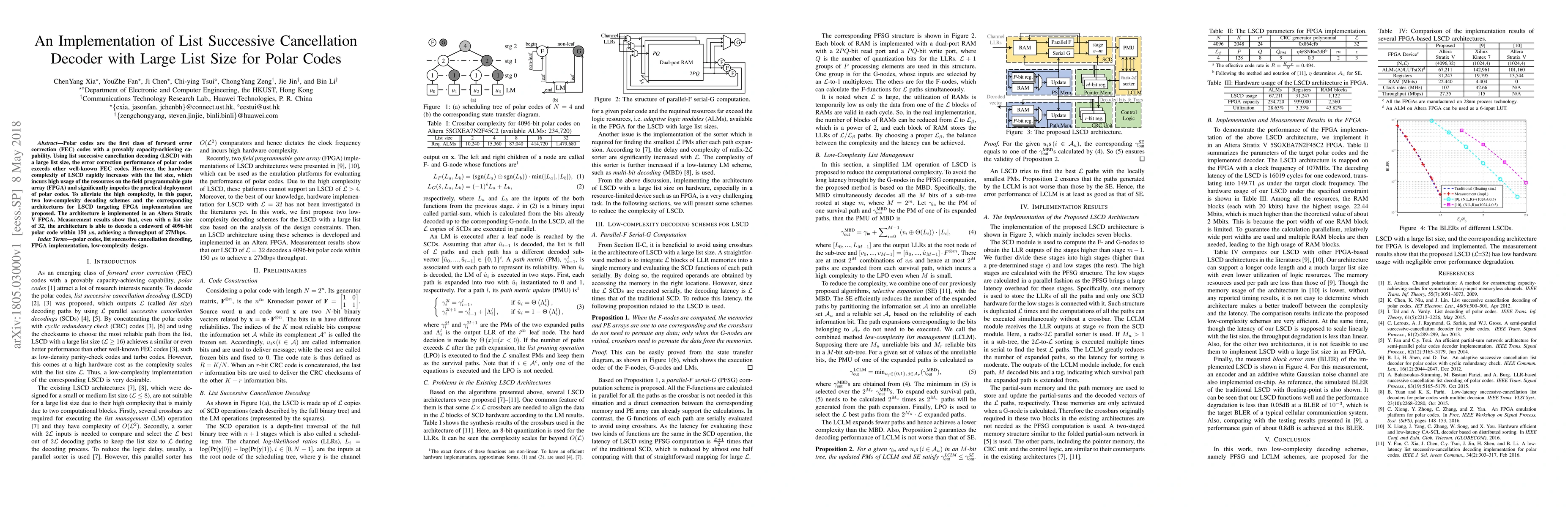 This paper proposes two low-complexity decoding schemes for list successive cancellation decoding (LSCD) of polar codes to mitigate hardware complexity, enabling practical FPGA implementation. The proposed architectures achieve a throughput of 27Mbps for 4096-bit polar codes with a list size of 32, within 150 us on an Altera Stratix V FPGA.