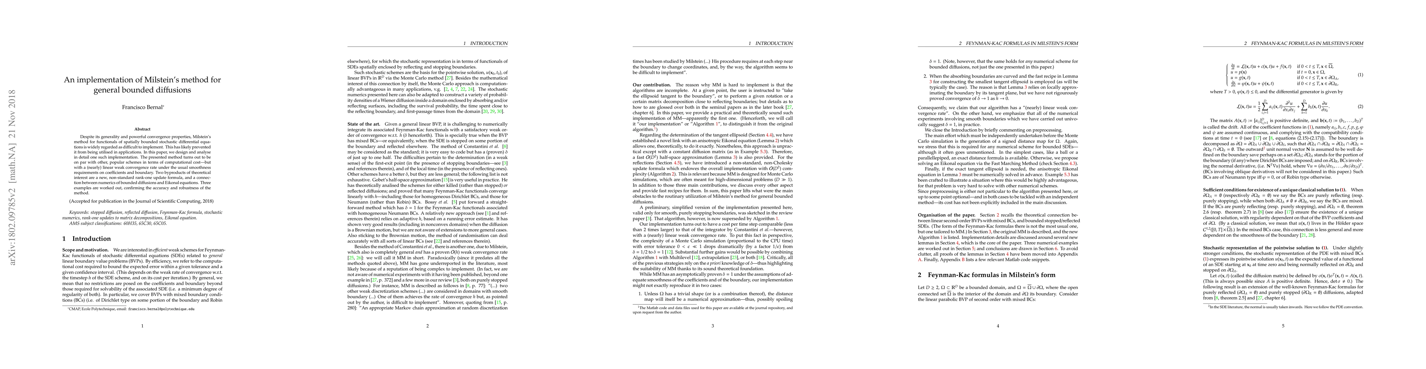 A new implementation of Milstein's method is proposed for general bounded diffusions, offering a computationally efficient solution with nearly linear weak convergence rate, comparable to other popular schemes, while also revealing new connections to Eikonal equations.