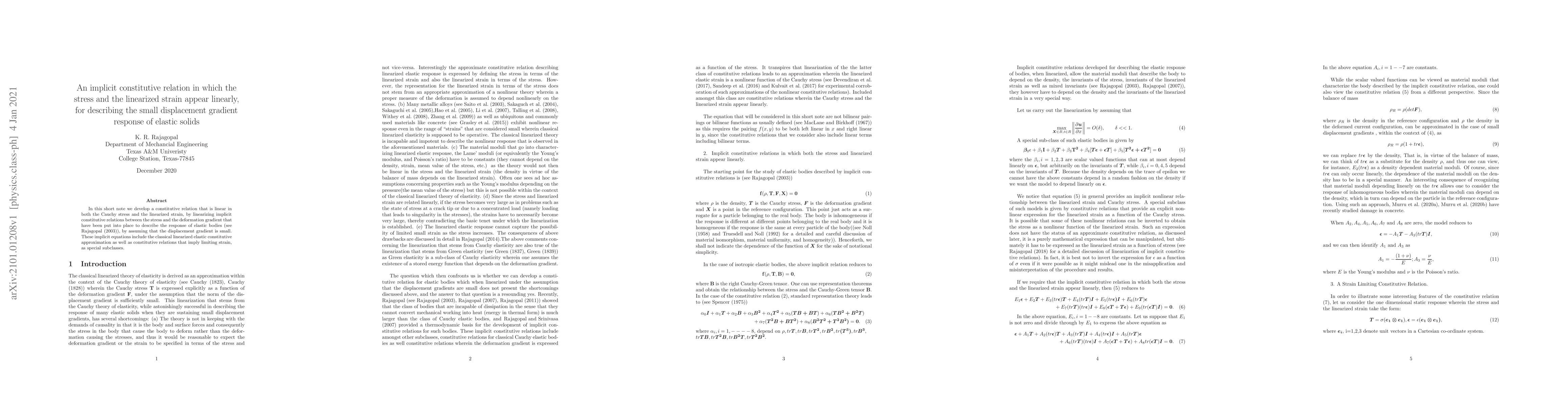 This paper proposes a linear constitutive relation between Cauchy stress and linearized strain for small displacement gradients in elastic solids, derived by linearizing implicit constitutive equations from prior work, encompassing classical linear elasticity and limiting strain models.