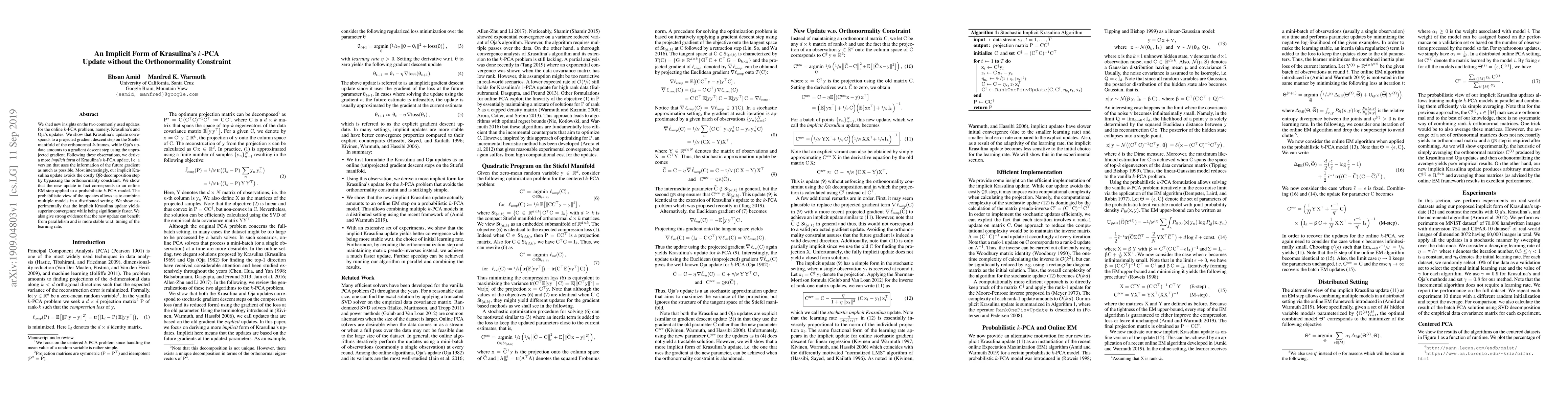 We shed new insights on the two commonly used updates for the online $k$-PCA problem, namely, Krasulina's and Oja's updates. We show that Krasulina's update corresponds to a projected gradient descent step on the Stiefel manifold of the orthonormal $k$-frames, while Oja's update amounts to a gradient descent step using the unprojected gradient. Following these observations, we derive a more \emph{implicit} form of Krasulina's $k$-PCA update, i.e. a version that uses the information of the future gradient as much as possible. Most interestingly, our implicit Krasulina update avoids the costly QR-decomposition step by bypassing the orthonormality constraint. We show that the new update in fact corresponds to an online EM step applied to a probabilistic $k$-PCA model. The probabilistic view of the updates allows us to combine multiple models in a distributed setting. We show experimentally that the implicit Krasulina update yields superior convergence while being significantly faster. We also give strong evidence that the new update can benefit from parallelism and is more stable w.r.t. tuning of the learning rate.