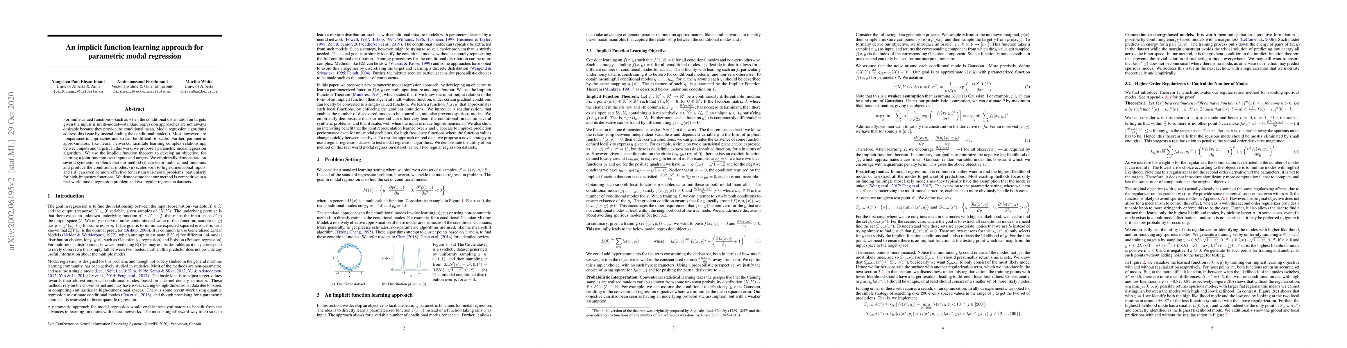 A new parametric approach to modal regression is proposed, leveraging the implicit function theorem to learn multi-valued functions and produce conditional modes, with promising results on synthetic and real-world datasets.