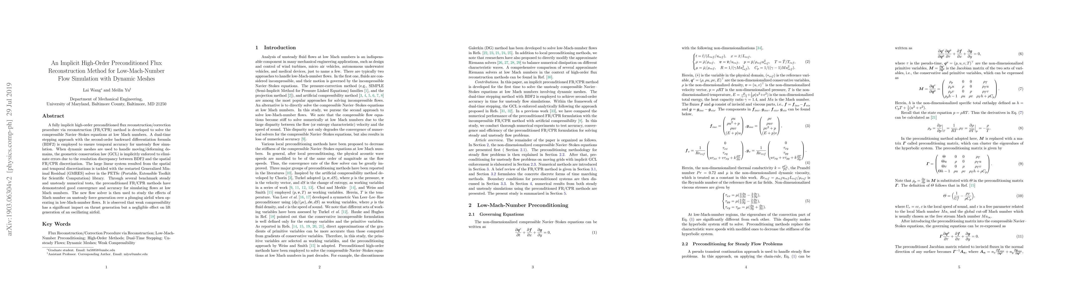 A fully implicit high-order preconditioned flux reconstruction/correction procedure via reconstruction (FR/CPR) method is developed to solve the compressible Navier-Stokes equations at low Mach numbers. A dual-time stepping approach with the second-order backward differentiation formula (BDF2) is employed to ensure temporal accuracy for unsteady flow simulation. When dynamic meshes are used to handle moving/deforming domains, the geometric conservation law (GCL) is implicitly enforced to eliminate errors due to the resolution discrepancy between BDF2 and the spatial FR/CPR discretization. The large linear system resulted from the spatial and temporal discretizations is tackled with the restarted Generalized Minimal Residual (GMRES) solver in the PETSc (Portable, Extensible Toolkit for Scientific Computation) library. Through several benchmark steady and unsteady numerical tests, the preconditioned FR/CPR methods have demonstrated good convergence and accuracy for simulating flows at low Mach numbers. The new flow solver is then used to study the effects of Mach number on unsteady force generation over a plunging airfoil when operating in low-Mach-number flows. It is observed that weak compressibility has a significant impact on thrust generation but a negligible effect on lift generation of an oscillating airfoil.