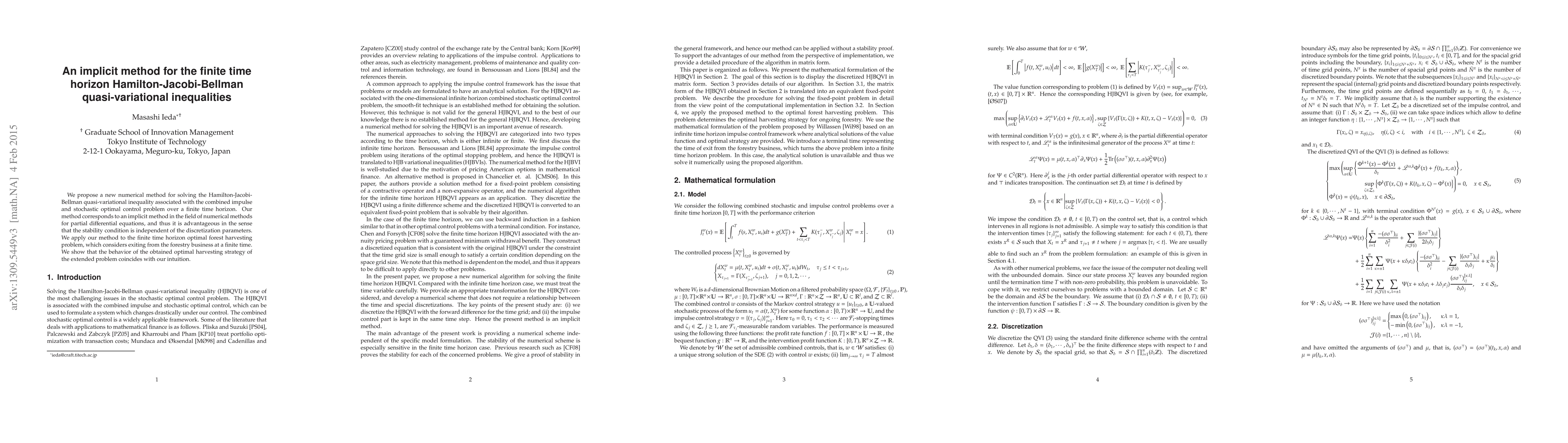 This paper introduces an implicit numerical method for solving Hamilton-Jacobi-Bellman quasi-variational inequalities in optimal control problems, demonstrating stability independent of discretization parameters. The method is applied to a finite time horizon forest harvesting problem, showing intuitive optimal harvesting strategies.
