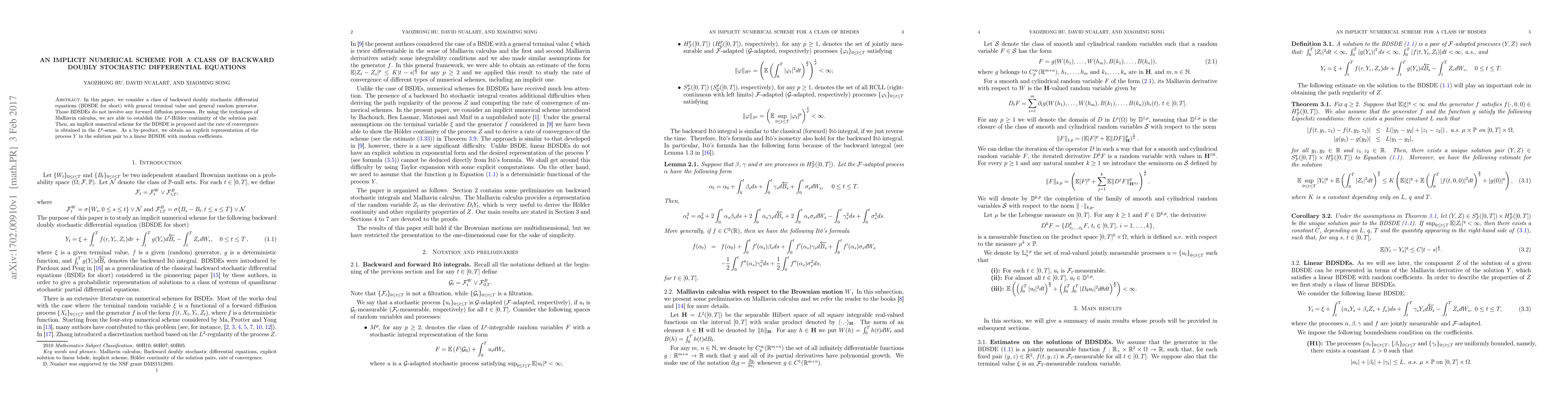 This paper develops an implicit numerical scheme for solving backward doubly stochastic differential equations (BDSDEs) with general terminal value and random generator, establishing $L^p$-Hölder continuity of solutions using Malliavin calculus. The proposed scheme achieves convergence in the $L^p$-sense and provides an explicit representation for the $Y$ process in linear BDSDEs with random coefficients.