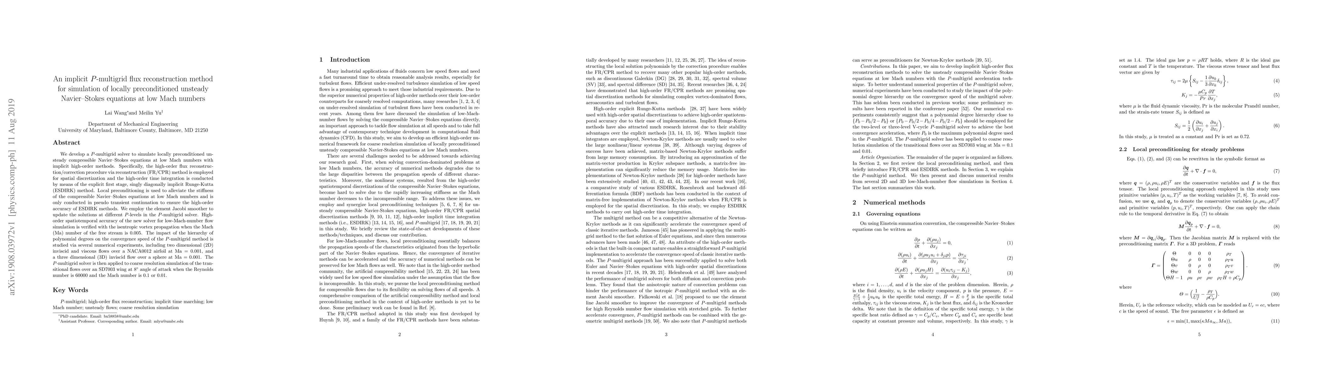 We develop a $ P $-multigrid solver to simulate locally preconditioned unsteady compressible Navier-Stokes equations at low Mach numbers with implicit high-order methods. Specifically, the high-order flux reconstruction/correction procedure via reconstruction (FR/CPR) method is employed for spatial discretization and the high-order time integration is conducted by means of the explicit first stage, singly diagonally implicit Runge-Kutta (ESDIRK) method. Local preconditioning is used to alleviate the stiffness of the compressible Navier-Stokes equations at low Mach numbers and is only conducted in pseudo transient continuation to ensure the high-order accuracy of ESDIRK methods. We employ the element Jacobi smoother to update the solutions at different $ P $-levels in the $ P $-multigrid solver. High-order spatiotemporal accuracy of the new solver for low-Mach-number flow simulation is verified with the isentropic vortex propagation when the Mach (Ma) number of the free stream is 0.005. The impact of the hierarchy of polynomial degrees on the convergence speed of the $ P $-multigrid method is studied via several numerical experiments, including two dimensional (2D) inviscid and viscous flows over a NACA0012 airfoil at $\text{Ma} = 0.001$, and a three dimensional (3D) inviscid flow over a sphere at $\text{Ma} = 0.001$. The $ P $-multigrid solver is then applied to coarse resolution simulation of the transitional flows over an SD7003 wing at $ 8^\circ $ angle of attack when the Reynolds number is 60000 and the Mach number is 0.1 or 0.01.