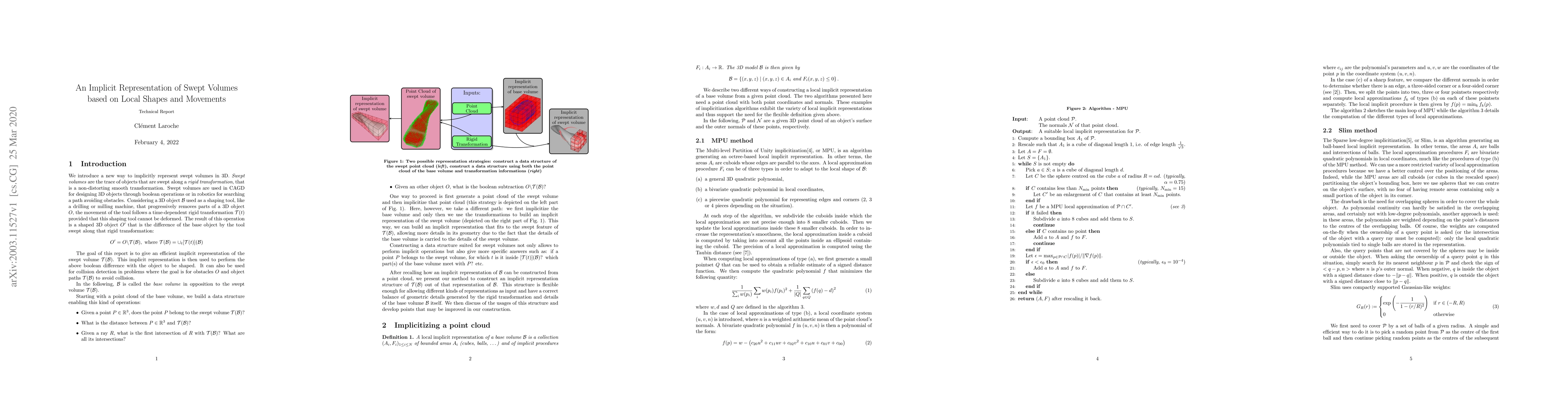 This paper proposes an implicit representation of swept volumes in 3D by combining the base volume with time-dependent rigid transformations. It partitions the boundary box of the swept volume to account for both the base volume's geometric details and the transformation's effects over time.