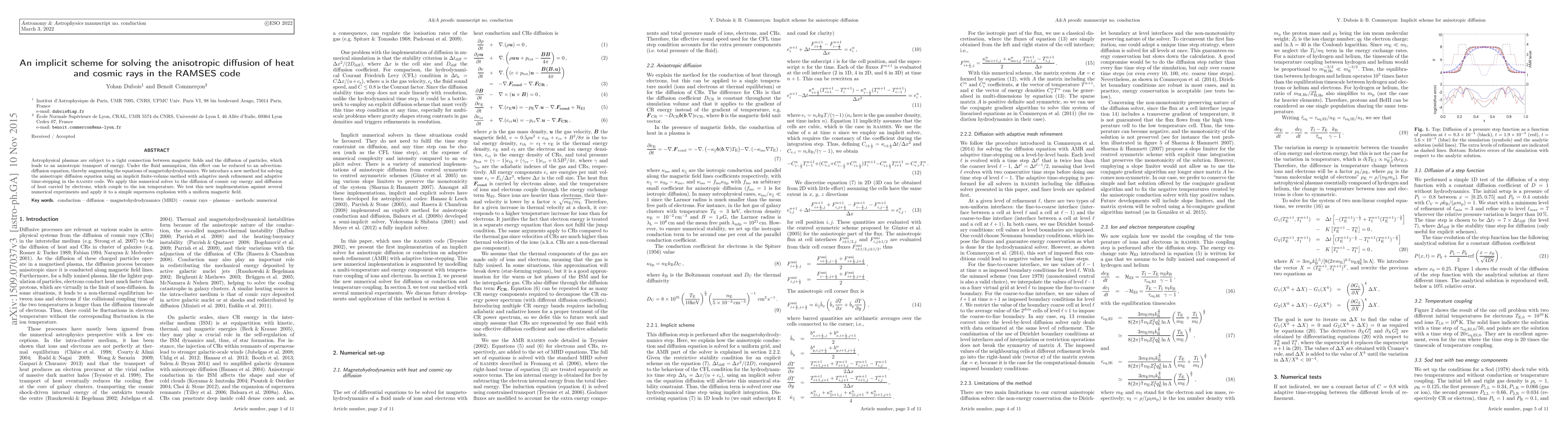 This paper introduces an implicit finite-volume method for solving the anisotropic diffusion equation in the RAMSES code, focusing on the diffusion of cosmic ray energy and heat carried by electrons. The method employs adaptive mesh refinement and time-stepping, and is tested against numerical experiments and a supernova explosion scenario.