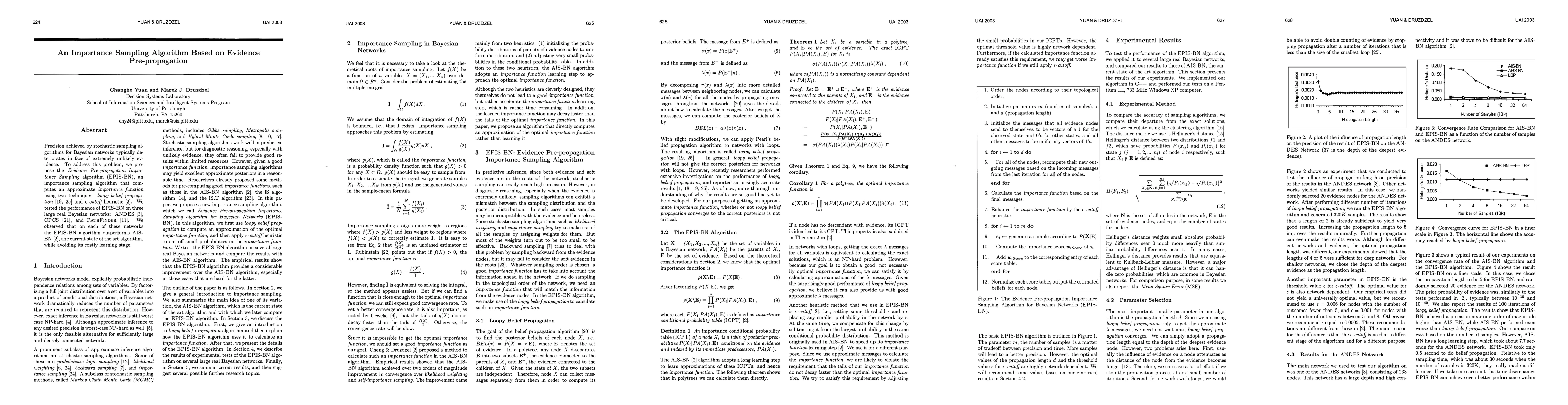 The EPIS-BN algorithm enhances precision in stochastic sampling for Bayesian networks by using evidence pre-propagation and heuristic methods like loopy belief propagation and e-cutoff, outperforming the current AIS-BN algorithm on large networks without requiring a costly learning stage.