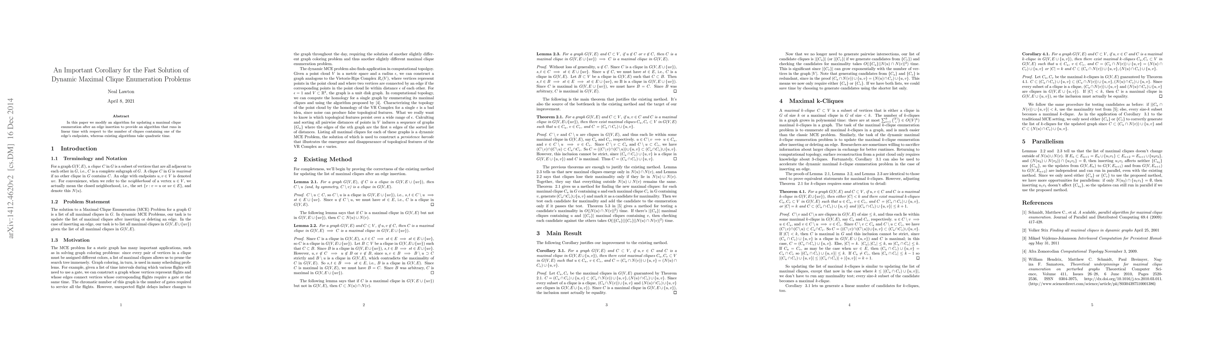 Summary: This paper presents a linear-time algorithm for updating maximal clique enumeration after edge insertion, significantly improving upon existing quadratic-time methods by focusing on cliques containing the edge's endpoints.