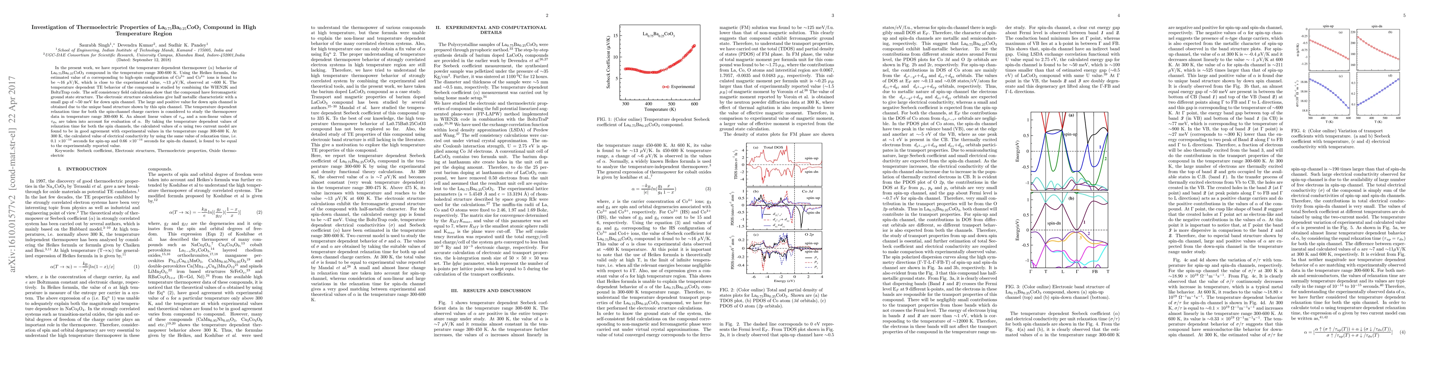 In the present work, we have reported the temperature dependent thermopower ($\alpha$) behavior of La$_{0.75}$Ba$_{0.25}$CoO$_{3}$ compound in the temperature range 300-600 K. Using the Heikes formula, the estimated value of $\alpha$ corresponding to high-spin configuration of Co$^{3+}$ and Co$^{4+}$ ions is found to be $\sim$$16$ $\mu$V/K, which is close to the experimental value, $\sim$13 $\mu$V/K, observed at $\sim$600 K. The temperature dependent TE behavior of the compound is studied by combining the WIEN2K and BoltzTrap code. The self consistency field calculations show that the compound have ferromagnetic ground state structure. The electronic structure calculations give half metallic characteristic with a small gap of $\sim$50 meV for down spin channel. The large and positive value for down spin channel is obtained due to the unique band structure shown by this spin channel. The temperature dependent relaxation time for both the spin-channel charge carriers is considered to study the thermopower data in temperature range 300-600 K. An almost linear values of $\tau_{up}$ and a non-linear values of $\tau_{dn}$ are taken into account for evaluation of $\alpha$. By taking the temperature dependent values of relaxation time for both the spin channels, the calculated values of $\alpha$ using two current model are found to be in good agreement with experimental values in the temperature range 300-600 K. At 300 K, the calculated value of electrical conductivity by using the same value of relaxation time, i.e. 0.1 $\times $10$^{-14}$ seconds for spin-up and 0.66 $\times $10$^{-14}$ seconds for spin-dn channel, is found to be equal to the experimentally reported value.