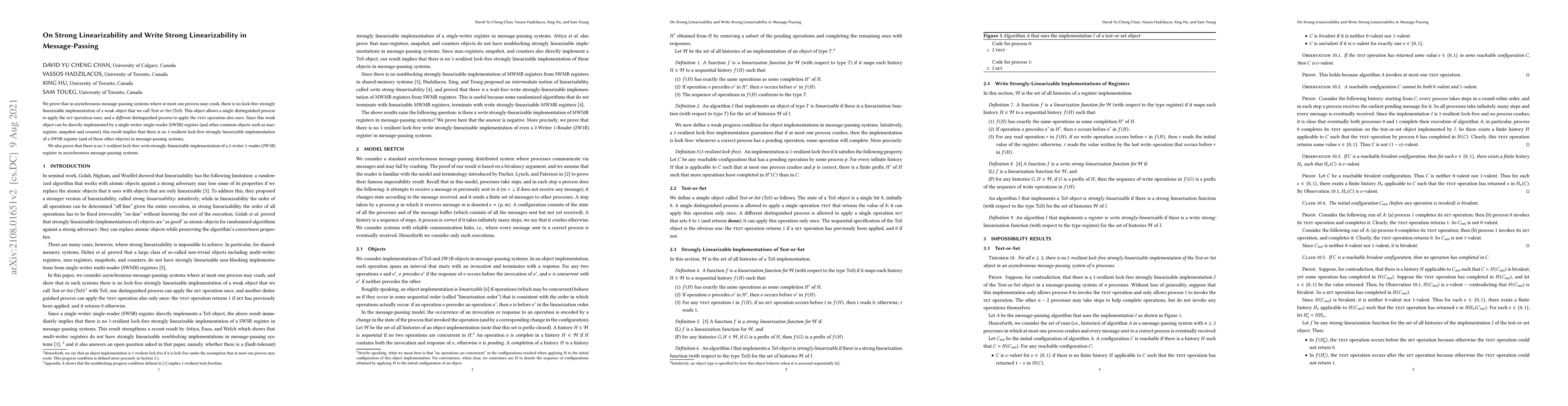 We prove that in asynchronous message-passing systems where at most one process may crash, there is no lock-free strongly linearizable implementation of a weak object that we call Test-or-Set (ToS). This object allows a single distinguished process to apply the set operation once, and a different distinguished process to apply the test operation also once. Since this weak object can be directly implemented by a single-writer single-reader (SWSR) register (and other common objects such as max-register, snapshot and counter), this result implies that there is no $1$-resilient lock-free strongly linearizable implementation of a SWSR register (and of these other objects) in message-passing systems. We also prove that there is no $1$-resilient lock-free \emph{write} strongly-linearizable implementation of a 2-writer 1-reader (2W1R) register in asynchronous message-passing systems.