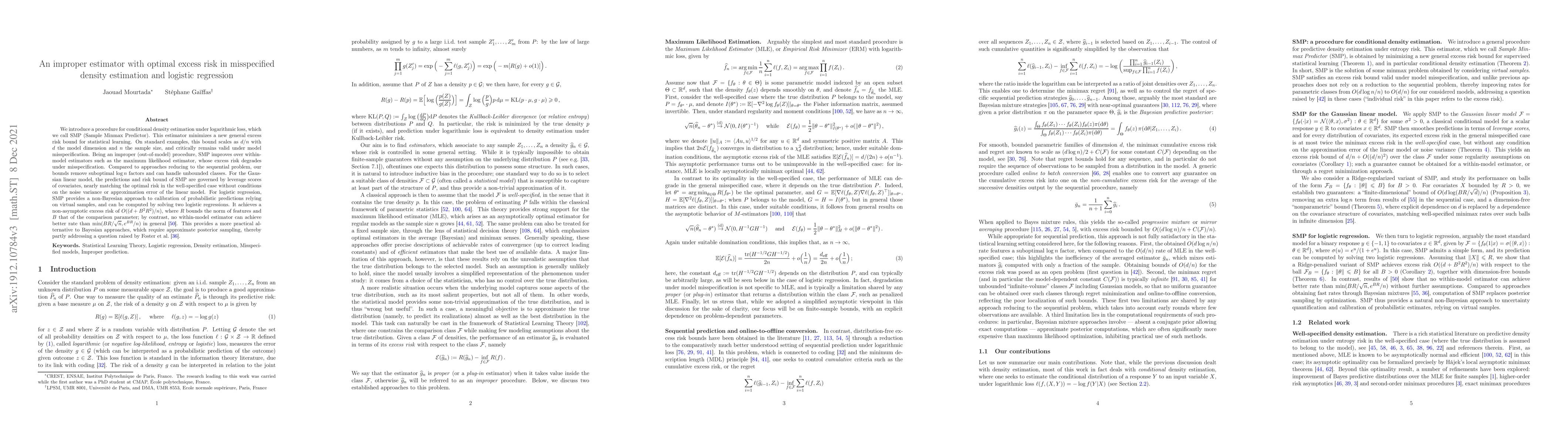 This paper introduces the SMP (Sample Minmax Predictor) estimator for conditional density estimation under logarithmic loss, which minimizes a new excess risk bound that remains valid under model misspecification. Unlike within-model estimators, SMP achieves optimal excess risk rates in both Gaussian linear models and logistic regression, providing a practical non-Bayesian alternative.