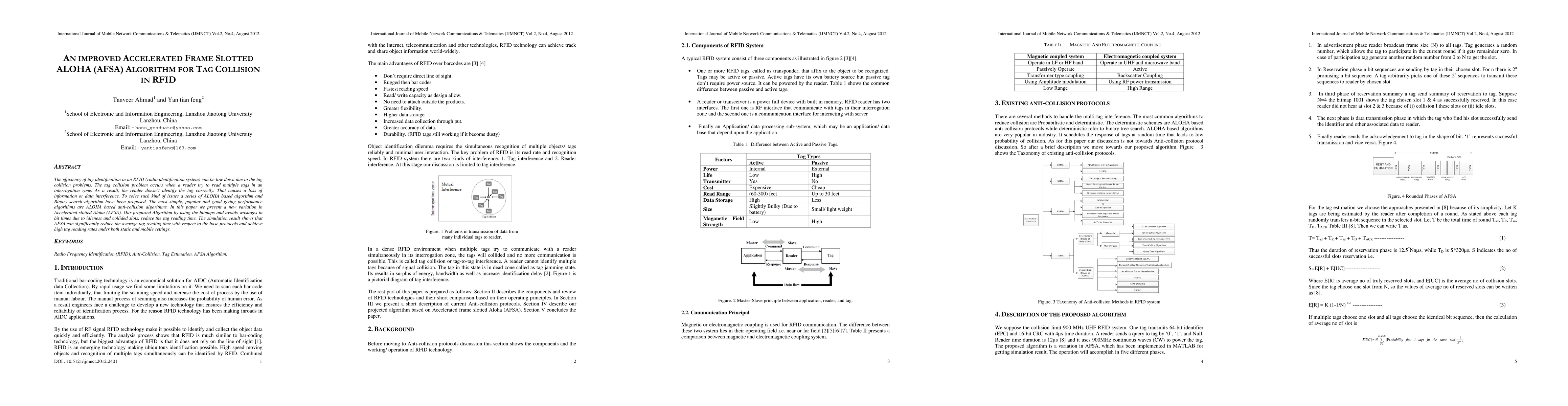 The paper introduces an improved Accelerated Frame Slotted Aloha (AFSA) algorithm to tackle RFID tag collision issues, which cause inefficient identification. The AFSA uses bitmaps to minimize wasted bit times from idleness and collisions, significantly reducing average tag reading time and enhancing reading rates under both static and mobile conditions, as demonstrated by simulations.