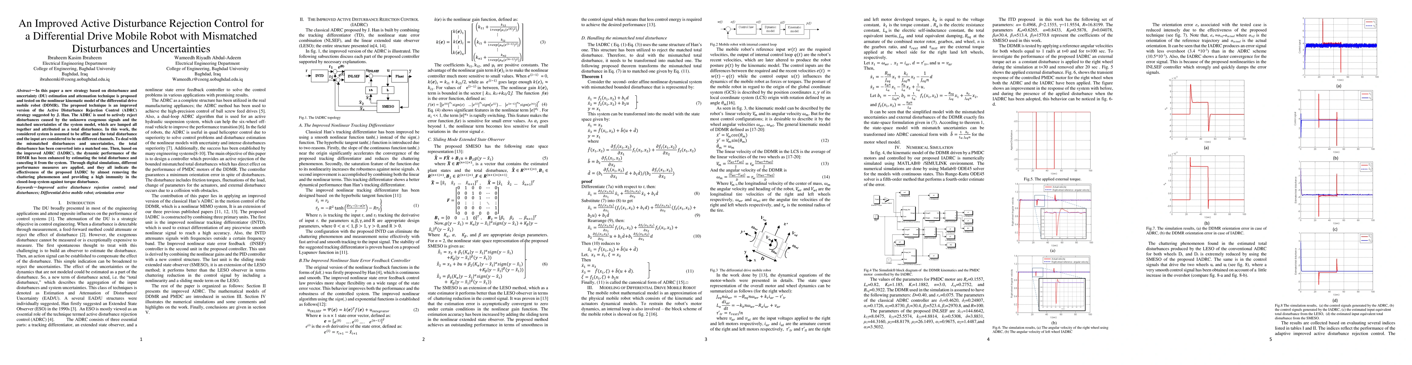 In this paper a new strategy based on disturbance and uncertainty (DU) estimation and attenuation technique is proposed and tested on the nonlinear kinematic model of the differential drive mobile robot (DDMR). The proposed technique is an improved version of the Active Disturbance Rejection Control (ADRC) strategy suggested by J. Han. The ADRC is used to actively reject disturbances caused by the unknown exogenous signals and the matched uncertainties of the system model, which are lumped all together and attributed as a total disturbance. In this work, the considered system is assumed to be affine and the total disturbance and the input are considered to be on different channels. To deal with the mismatched disturbances and uncertainties, the total disturbance has been converted into a matched one. Then, based on the improved ADRC (IADRC), the dynamic performance of the DDMR has been enhanced by estimating the total disturbance and canceling it from the system. Through digital simulations, different performance measures are applied, and they all indicate the effectiveness of the proposed IADRC by almost removing the chattering phenomenon and providing a high immunity in the closed-loop system against torque disturbance.