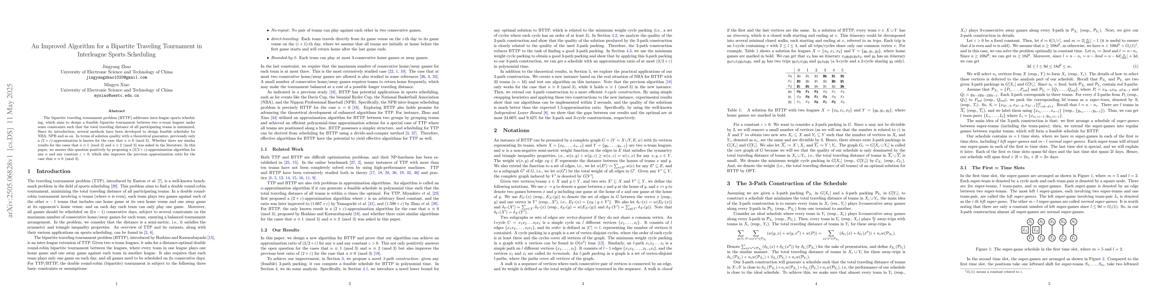 The paper proposes an algorithmic approach to address the bipartite traveling tournament problem (BTTP) in interleague sports scheduling, focusing on minimizing total travel distance for two n-team leagues under given constraints.