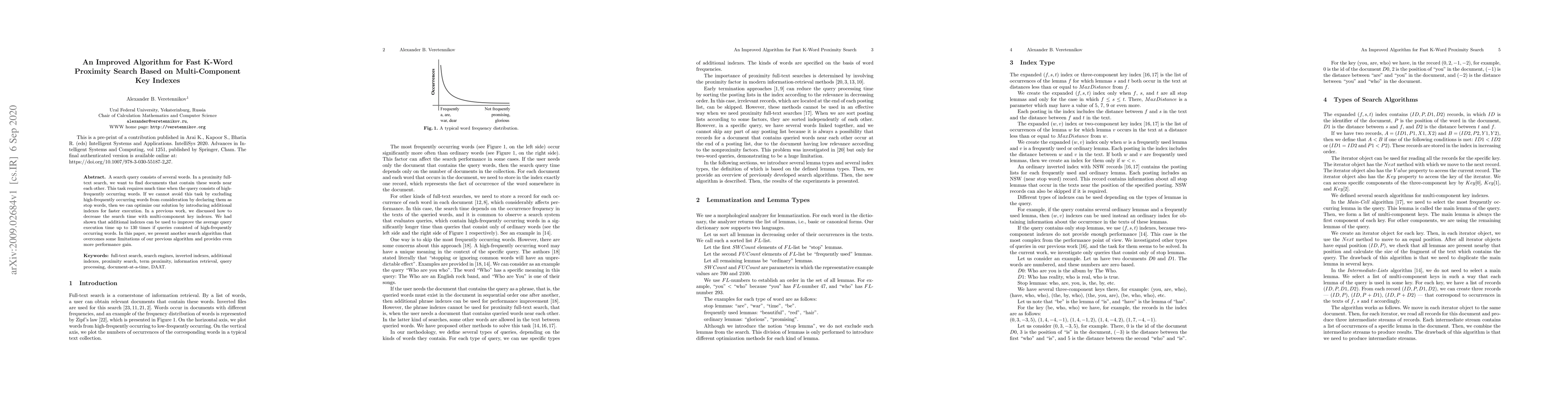 A search query consists of several words. In a proximity full-text search, we want to find documents that contain these words near each other. This task requires much time when the query consists of high-frequently occurring words. If we cannot avoid this task by excluding high-frequently occurring words from consideration by declaring them as stop words, then we can optimize our solution by introducing additional indexes for faster execution. In a previous work, we discussed how to decrease the search time with multi-component key indexes. We had shown that additional indexes can be used to improve the average query execution time up to 130 times if queries consisted of high-frequently occurring words. In this paper, we present another search algorithm that overcomes some limitations of our previous algorithm and provides even more performance gain. This is a pre-print of a contribution published in Arai K., Kapoor S., Bhatia R. (eds) Intelligent Systems and Applications. IntelliSys 2020. Advances in Intelligent Systems and Computing, vol 1251, published by Springer, Cham. The final authenticated version is available online at: https://doi.org/10.1007/978-3-030-55187-2_37