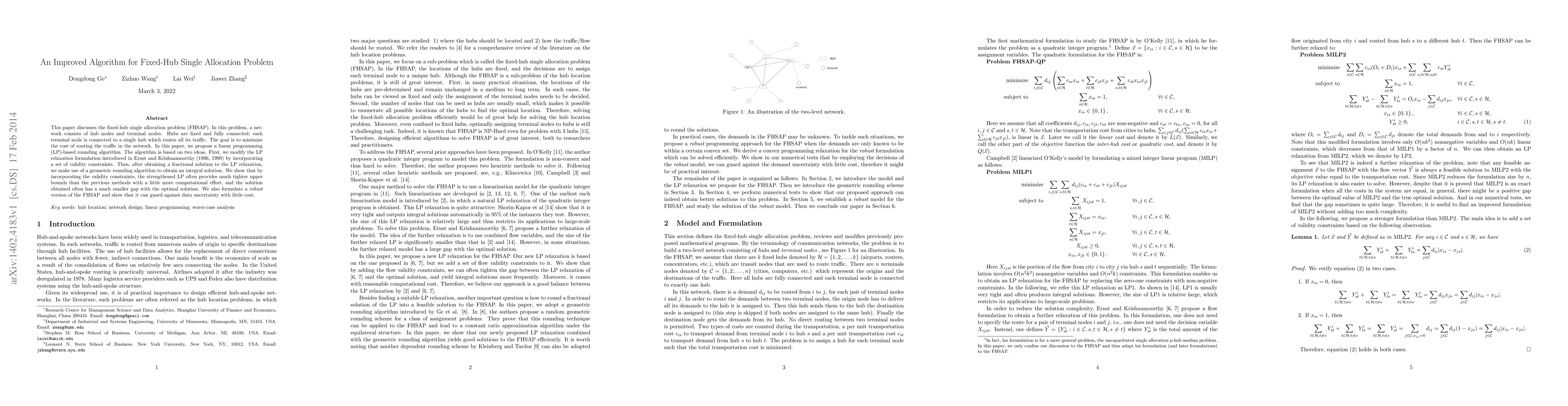 This paper discusses the fixed-hub single allocation problem (FHSAP). In this problem, a network consists of hub nodes and terminal nodes. Hubs are fixed and fully connected; each terminal node is connected to a single hub which routes all its traffic. The goal is to minimize the cost of routing the traffic in the network. In this paper, we propose a linear programming (LP)-based rounding algorithm. The algorithm is based on two ideas. First, we modify the LP relaxation formulation introduced in Ernst and Krishnamoorthy (1996, 1999) by incorporating a set of validity constraints. Then, after obtaining a fractional solution to the LP relaxation, we make use of a geometric rounding algorithm to obtain an integral solution. We show that by incorporating the validity constraints, the strengthened LP often provides much tighter upper bounds than the previous methods with a little more computational effort, and the solution obtained often has a much smaller gap with the optimal solution. We also formulate a robust version of the FHSAP and show that it can guard against data uncertainty with little cost.