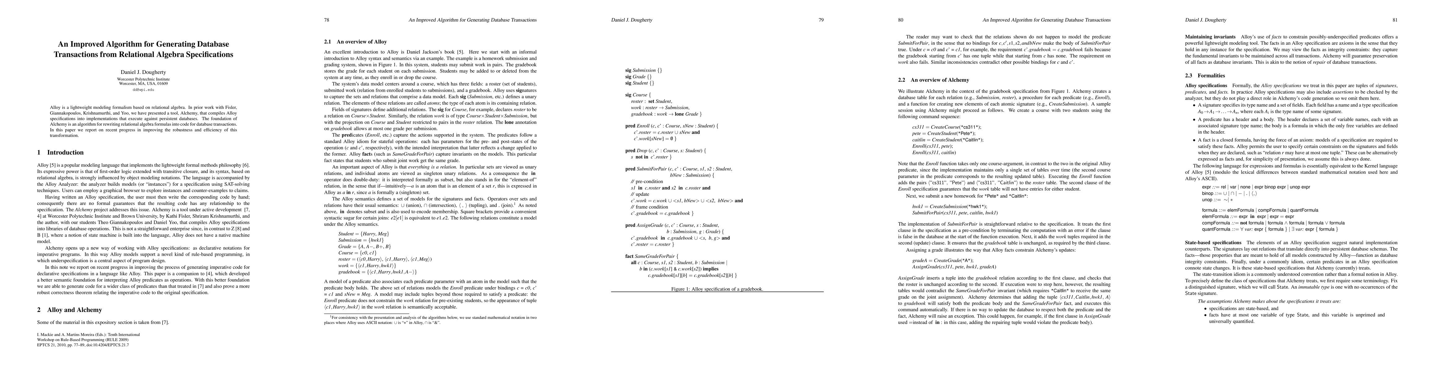 Alloy is a lightweight modeling formalism based on relational algebra. In prior work with Fisler, Giannakopoulos, Krishnamurthi, and Yoo, we have presented a tool, Alchemy, that compiles Alloy specifications into implementations that execute against persistent databases. The foundation of Alchemy is an algorithm for rewriting relational algebra formulas into code for database transactions. In this paper we report on recent progress in improving the robustness and efficiency of this transformation.