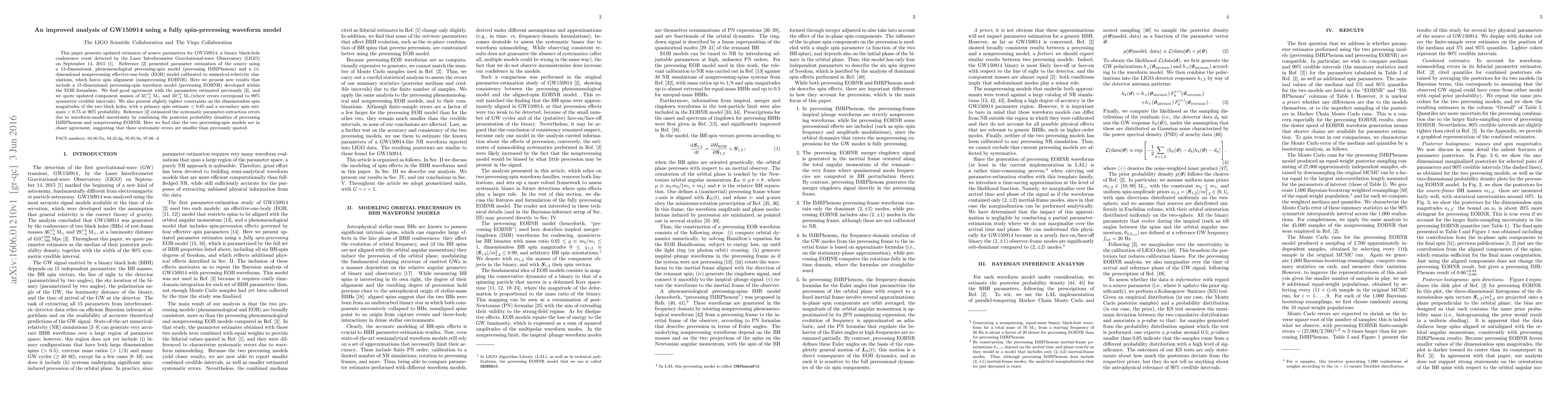 This paper updates the source parameters for GW150914 using a new 15-dimensional precessing-spin waveform model, finding component masses of $35^{+5}_{-3}\mathrm{M}_\odot$ and $30^{+3}_{-4}\mathrm{M}_\odot$ and tighter spin estimates of $0.65$ and $0.75$ for the primary and secondary black holes, respectively. The new model shows closer agreement than previous models, suggesting reduced systematic errors.