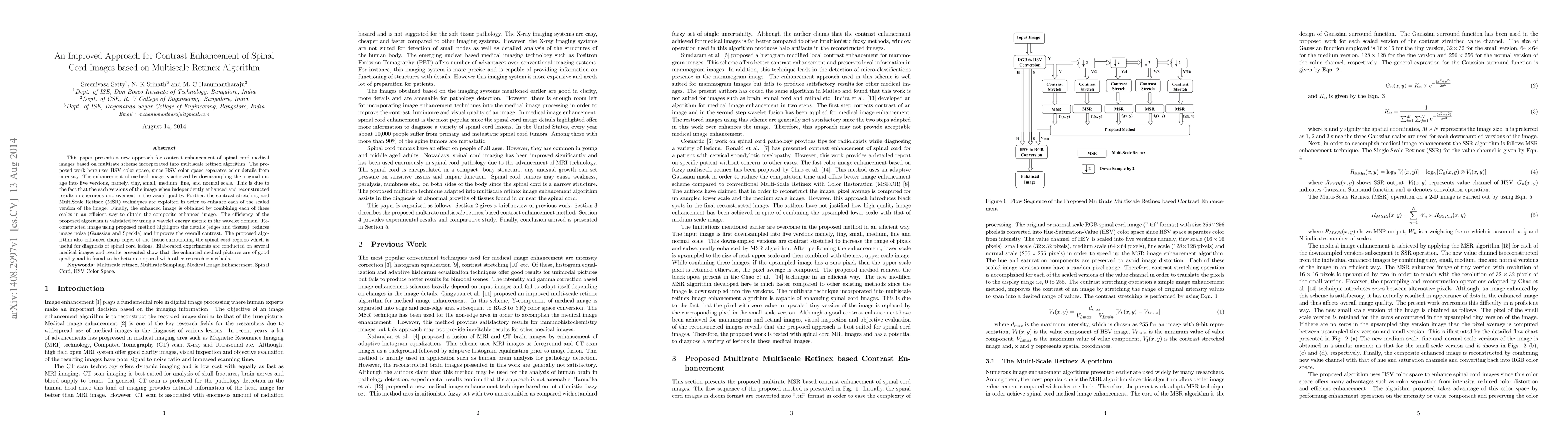 A new approach for contrast enhancement of spinal cord images is presented using a multiscale retinex algorithm with down-sampling in the HSV color space, improving image details, reducing noise, and enhancing sharp edges.