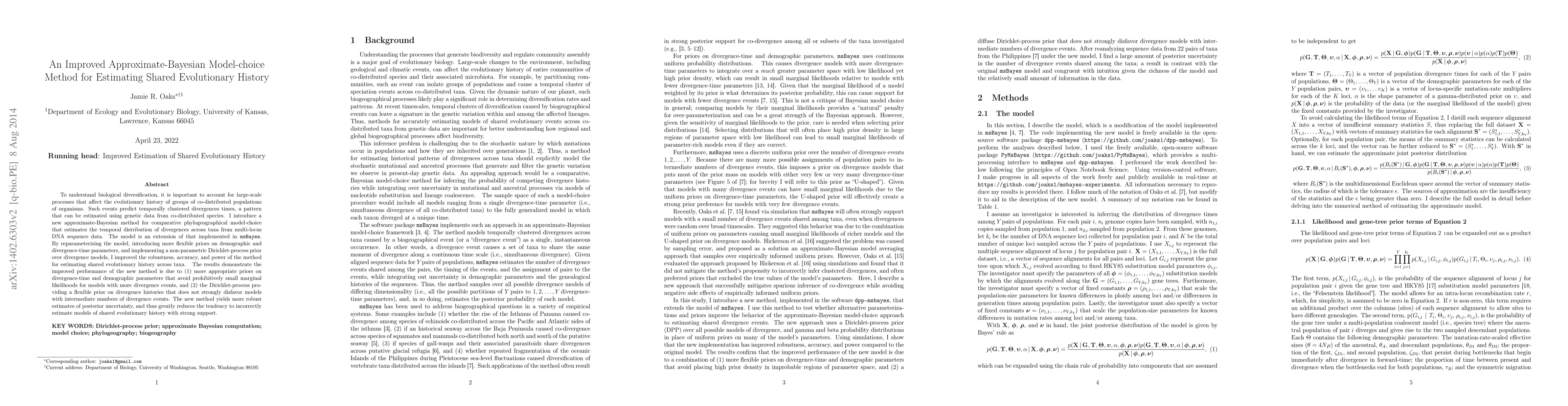 This paper introduces an improved approximate-Bayesian method for estimating shared evolutionary history across taxa using genetic data. The new method enhances robustness and accuracy by reparameterizing the model, employing flexible priors, and incorporating a non-parametric Dirichlet-process prior over divergence models, leading to more reliable estimates of posterior uncertainty.