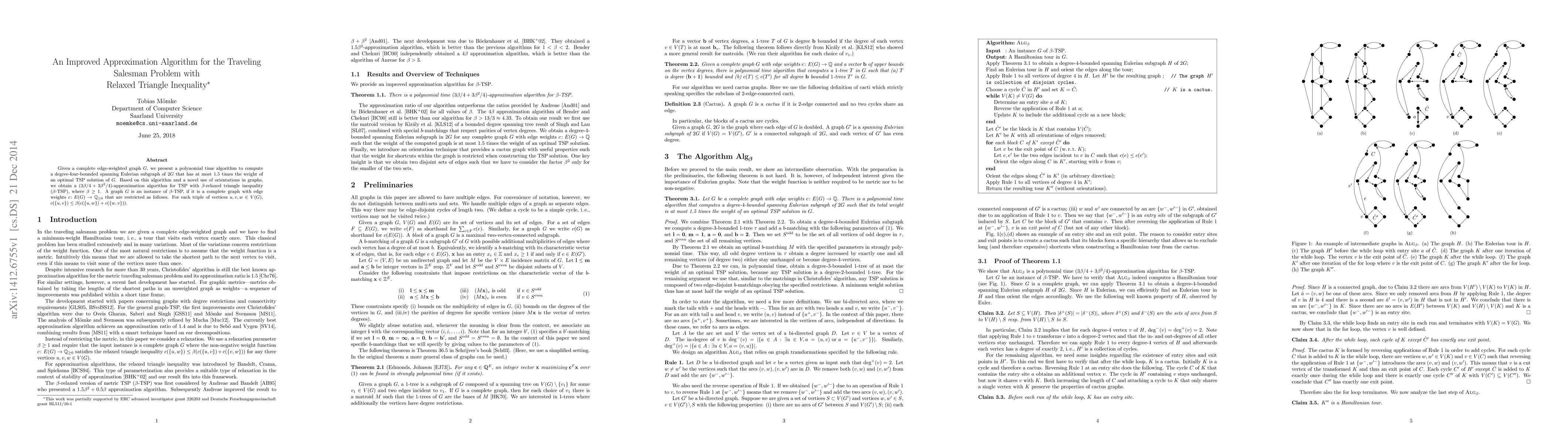 This paper introduces a polynomial time algorithm to compute a degree-four-bounded spanning Eulerian subgraph for a given complete edge-weighted graph, achieving a 1.5-approximation for the Traveling Salesman Problem. The authors further develop a (3 beta/4 + 3 beta^2/4)-approximation algorithm for the TSP with beta-relaxed triangle inequality.