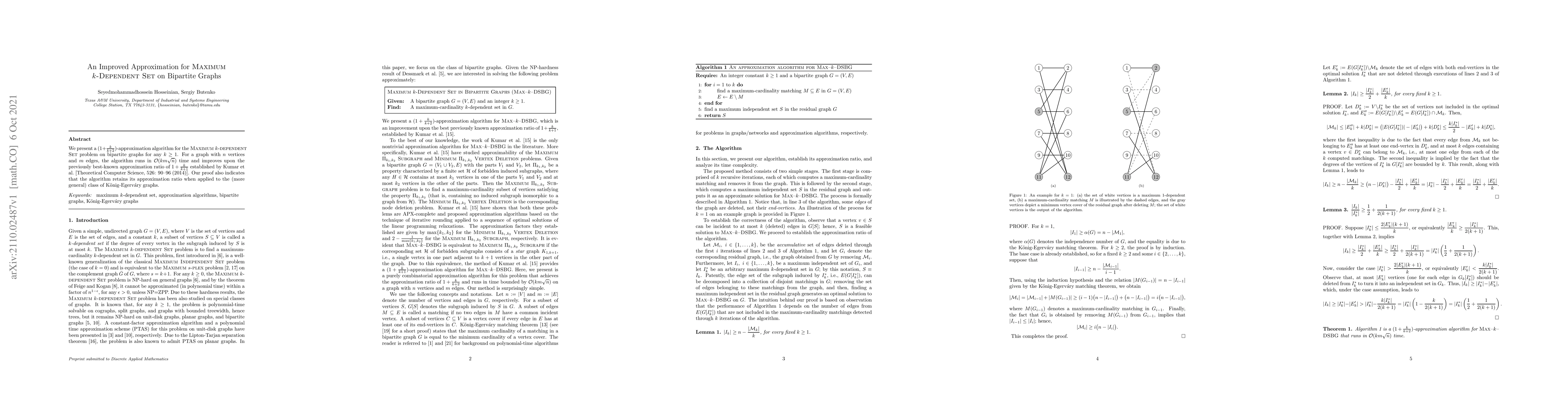 This paper introduces a $(1+\frac{k}{k+2})$-approximation algorithm for the Maximum $k$-dependent Set problem on bipartite graphs, improving upon the previous best-known ratio of $1+\frac{k}{k+1}$. The algorithm runs in $O(k m \sqrt{n})$ time and is also effective for König-Egerváry graphs.