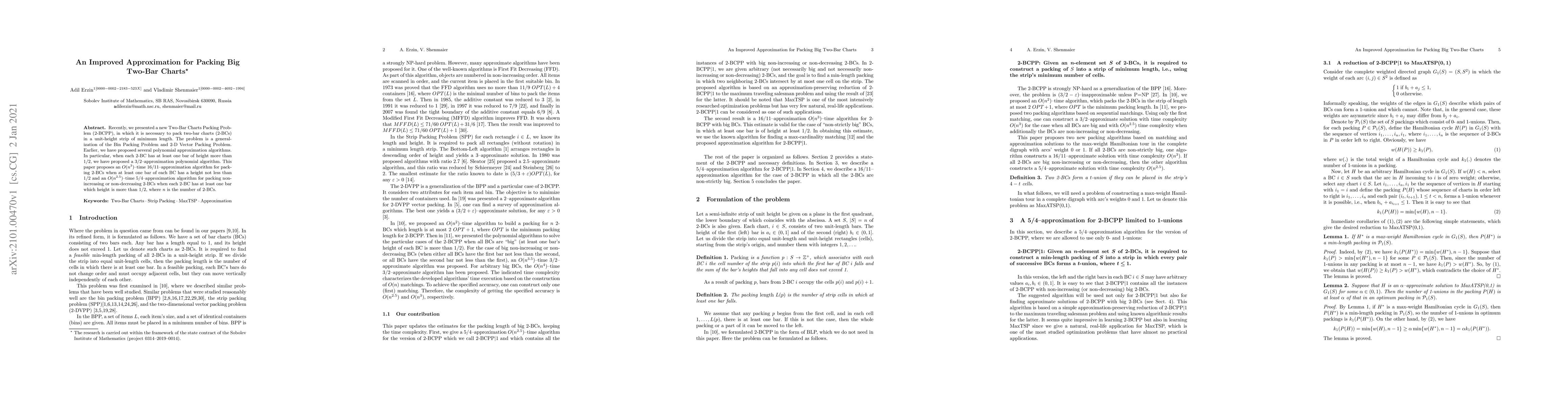 This paper introduces improved approximation algorithms for the Two-Bar Charts Packing Problem (2-BCPP), proposing a 16/11-approximation in $O(n^3)$ time for packing 2-BCs with at least one bar height ≥ 1/2, and a 5/4-approximation in $O(n^{2.5})$ time for specific ordered 2-BCs under the same height constraint.
