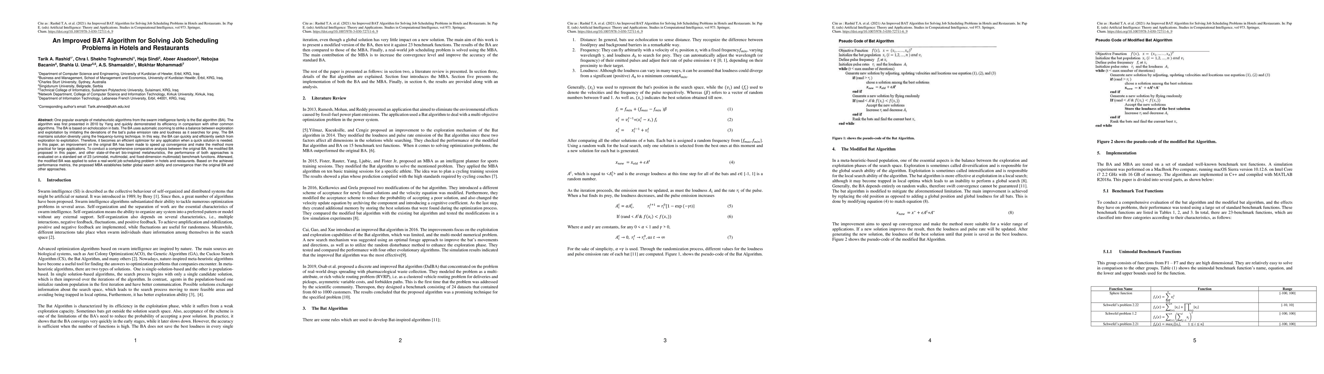 A modified Bat algorithm is proposed to improve convergence speed and practicality for large-scale job scheduling problems in hotels and restaurants, achieving better global search ability than original and other approaches.