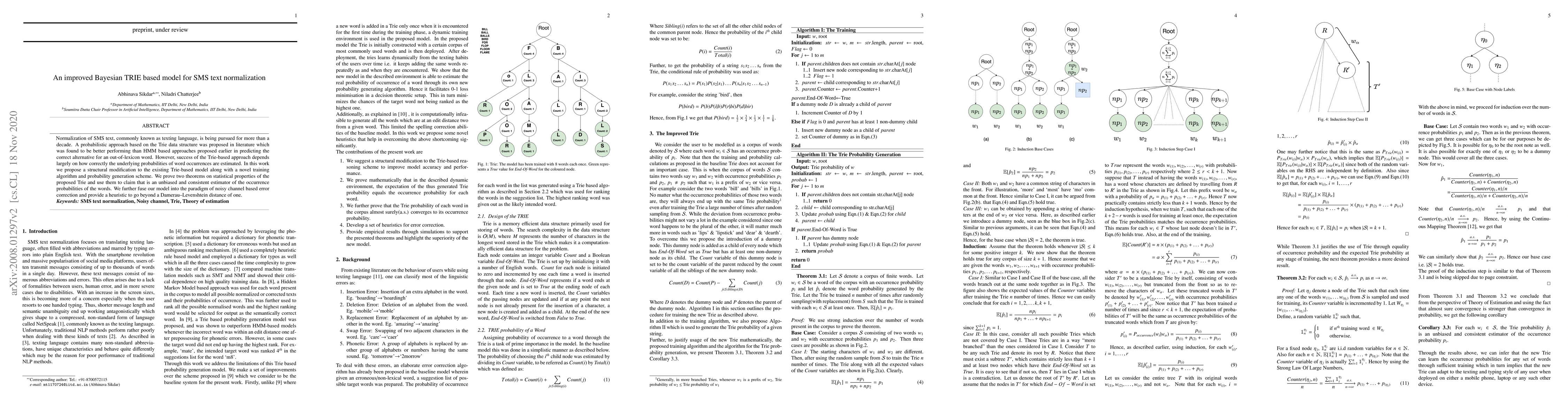 This paper proposes an enhanced Bayesian Trie model for SMS text normalization, incorporating structural modifications and a novel training algorithm. The authors demonstrate that the new Trie is an unbiased and consistent estimator of word occurrence probabilities, and show its superiority over previous methods through simulations.